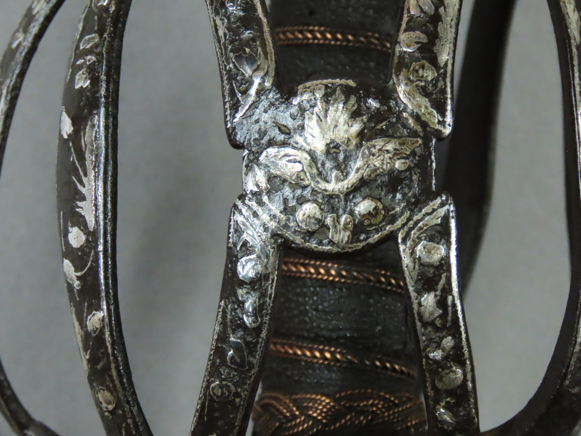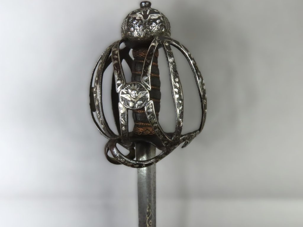The iron outer surfaces of the hilt have been chased with delicate chisel work into linear patterns, designs and shapes, including winged cherubs heads in raised relief. The hilt has then been blackened and the raised shapes encrusted with silver which markedly contrasts with the blackened background to give a striking appearance. This decorative technique required more time, skill and silver than was needed in standard silver gilding and was much more expensive to carry out. The technique was therefore only applied to the best manufactured English swords of the time including rapiers, riding swords, pillow swords and robe swords as well as basket hilted swords.
