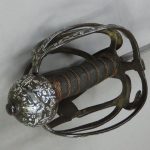 Our sword has a basket hilt which English sources refer to as “Irish”. From the English perspective the term “Irish Hilt” indicates its evolution from the basket hilted sword that was first developed in the Gaelic speaking regions of Highland Scotland and Ireland in the late 16th century. English sources grouped these people together and referred to them collectively as Irish. English armourers copied the sword style and applied their own modifications to the same hilt structure to create an English variant referred to it as “Irish” to differentiate it from other English hilt types. It was used by the English throughout the 17th century with modifications and advancements made during this time. The sword discussed here is a typical early example with a large globular pommel.