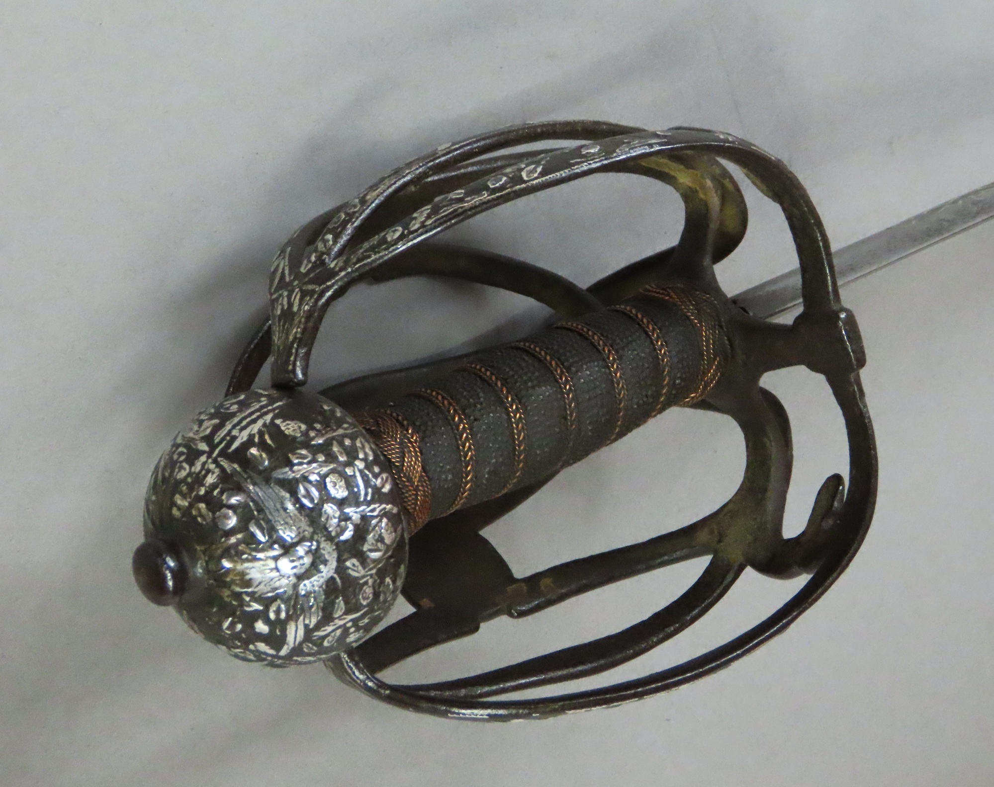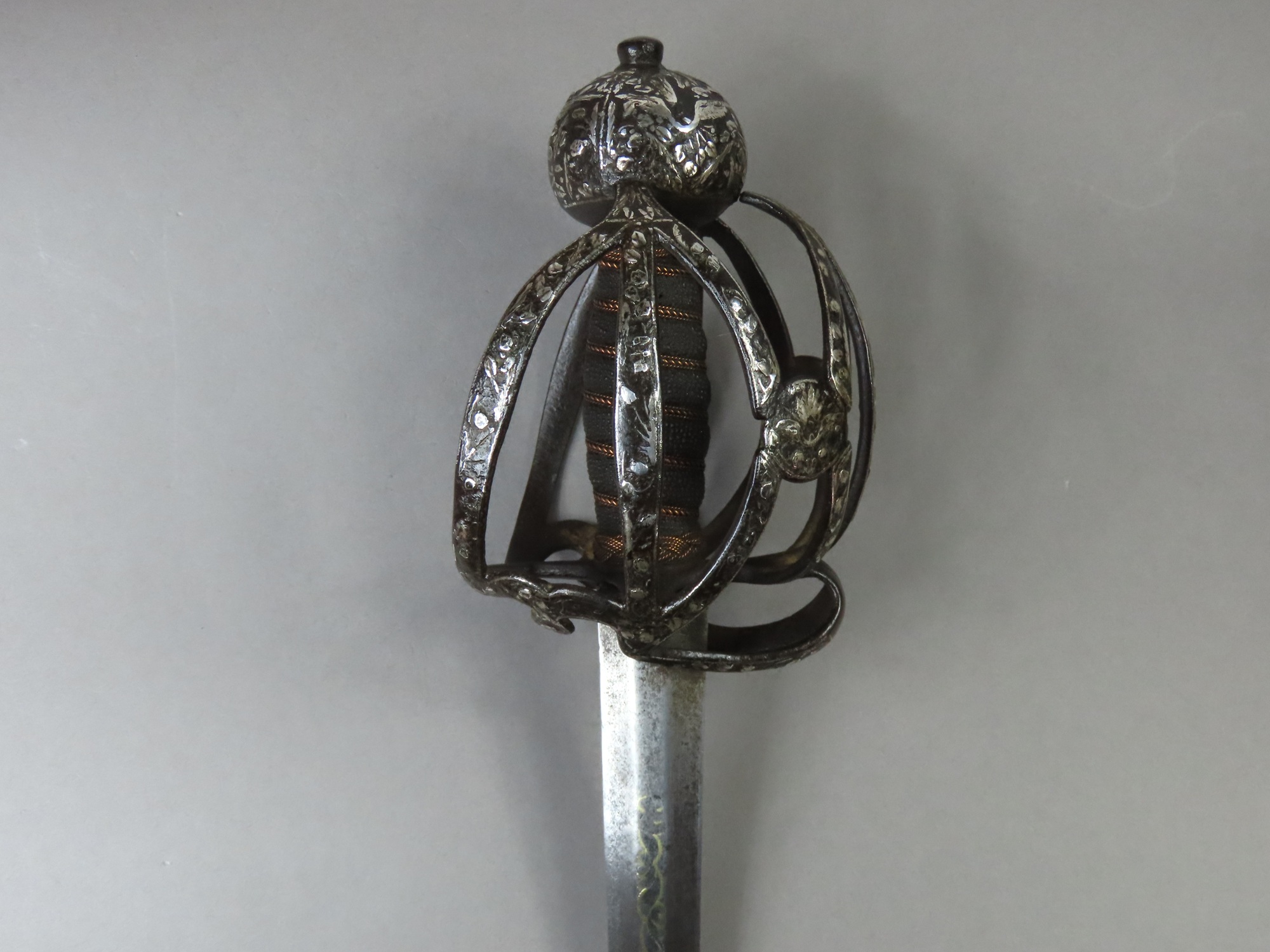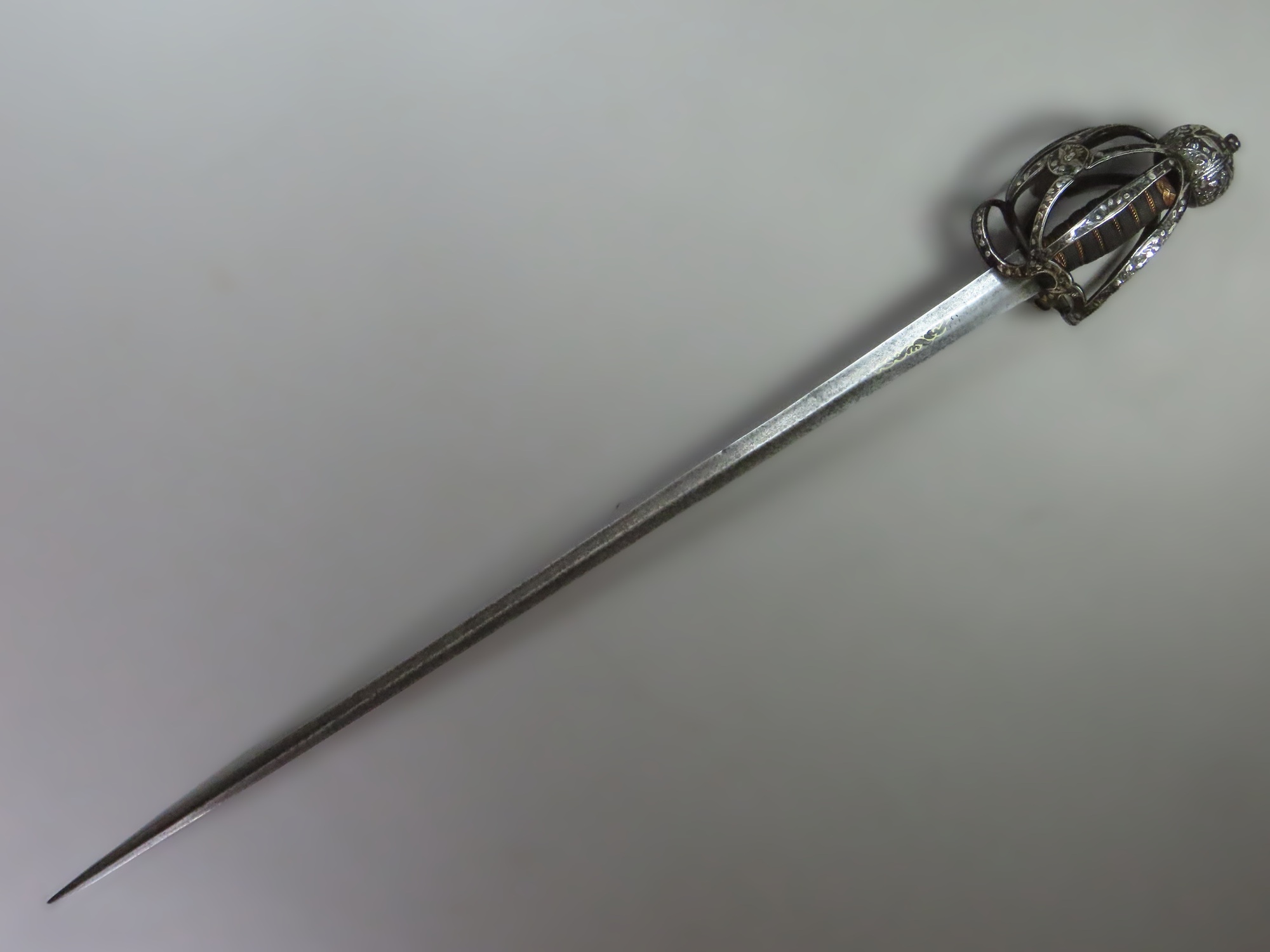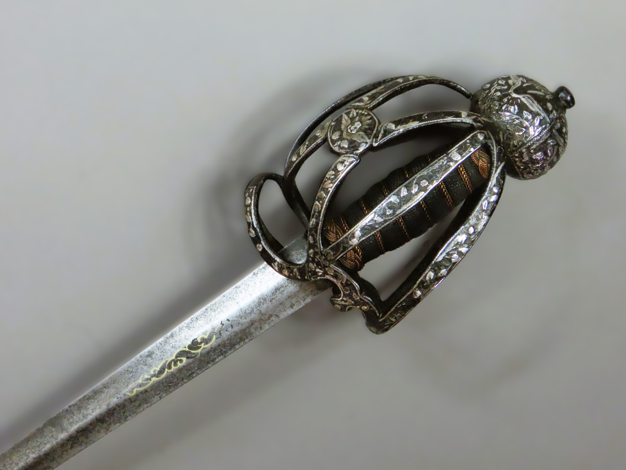 A fine and attractive English Basket Hilted Sword with silver encrusted hilt dating to the late 16th or early 17th century. This rare type of hilt decoration was reserved for wealthy individuals and the nobility as contemporary portraits show. Many of the surviving examples are in institutional collections and those still in private hands rarely come up for sale. This sword is known as the “How of Edinburgh” sword due to it once being part of the G E P How Collection (for further reference see below).