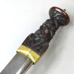 The hard wood grip, probably of bog oak, has a baluster shaped middle section, an inverted cone shaped pommel and raised haunches at the base. It has a rich, dark coloured patina and is deeply and skillfully carved in the early Gaelic Scottish Highland form of dirk decoration, consisting of two bands of intertwined reeded ropework in the middle, panels of the same at the haunches and a band of similar form carved onto the underside of the pommel. The main intersections are marked with small raised knops.