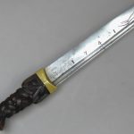 The mounts are of beaten brass consisting of a crescent shaped haunch mount which protects the underside of the grip into which the shoulders of the blade sit. The sides of the haunches are protected by brass strips of different widths corresponding to their alignment with either the cutting edge of the blade or the thicker back edge.  The flat pommel cap is decorated with concentric rings and the threaded tang of the blade is secured with a decorative cruciform shaped nut on top from which the tang terminal  protrudes for a short distance in the usual manner.