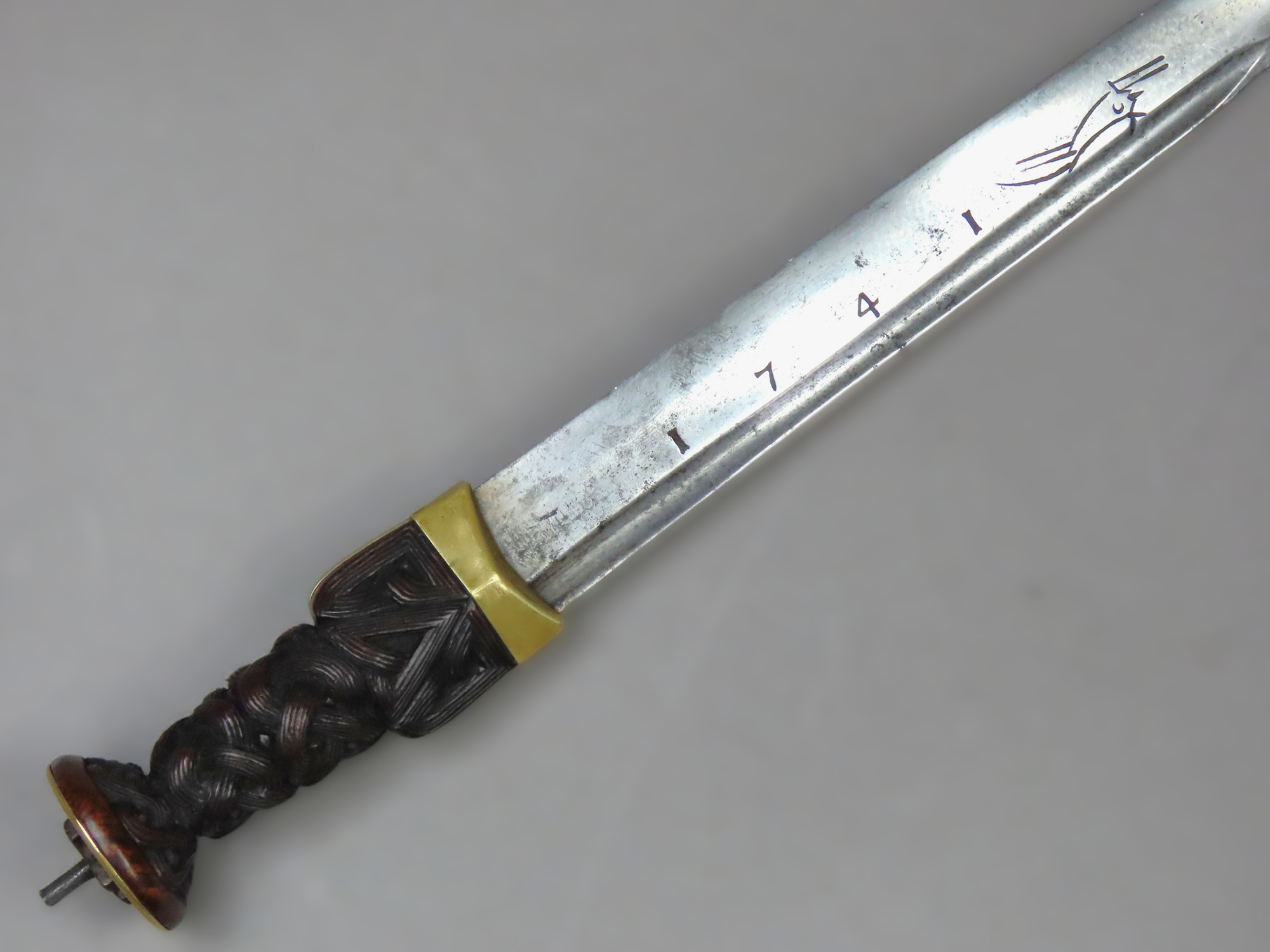 The sturdy tapering pointed blade has been fashioned from a German, Solingen made, back sword blade, of a type which was fashionable in the early 18th century. It has a pronounced fuller running from the hilt underneath the back edge on each side for just over half of its length after which it is double edged. The date “1741”followed by an incised Solingen running wolf mark on both sides.