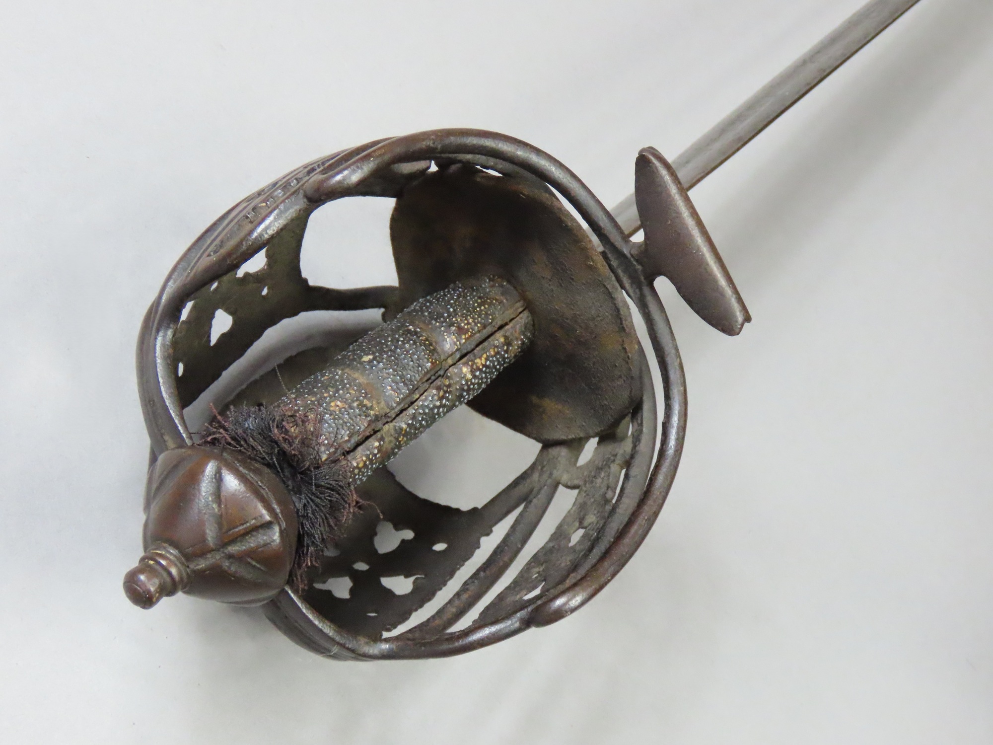 For a similar hilt see Cyril Mazansky, “British Basket-Hilted Swords”, The Boydell Press, 2005, page 115, fig F15i, for a sword in a private American collection.