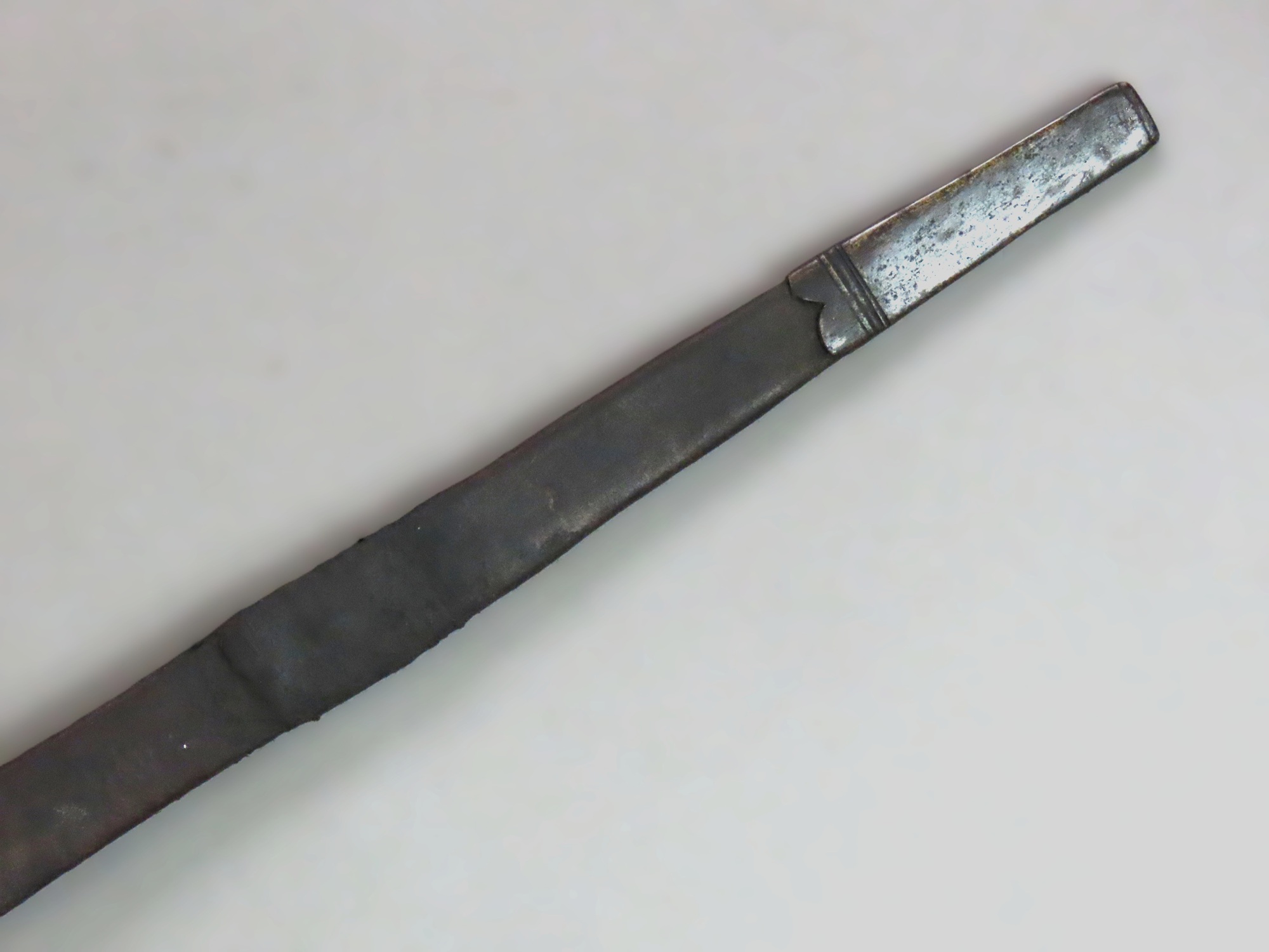 The blade was originally made as a double edged “broadsword” blade. During its working life the back edge has been filed blunt to create a “backsword” blade. This could have been done for a number of reasons. The front edge may have received a lot of use in a particular situation and the nicks have been filed out then the blade reversed in the hilt. Also, by the mid 18th century, backsword blades were becoming more fashionable and in some instances older broadsword blades were filed back and converted to suit the trend.