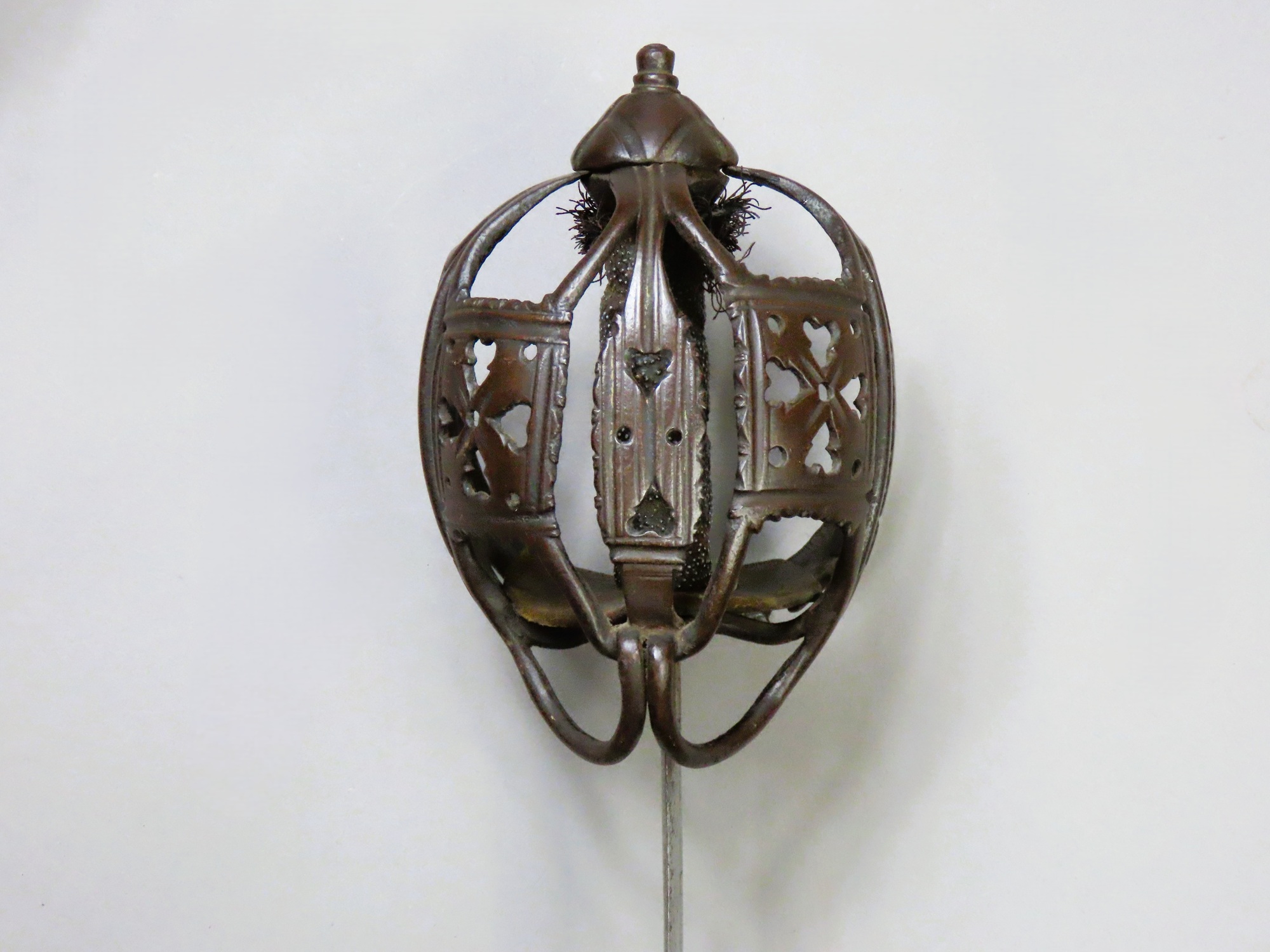 The fully developed basket guard is finely forged into an elegantly contoured profile. The two main frontal guard panels are decorated in traditional style, with bold vertical and horizontal border lines filed into the exterior surfaces towards the panel edges to form squares. Inside these squares a circle is pierced into the centre enhanced with filed lines to create a saltire shape. The panels are further decorated with four pierced flanged heart shapes which surround the centre circles. Four further circles are pierced into each corner of the panels. The smaller, secondary guard plates to the sides, and the knuckle bow at the front, are finished in similar style. The edges of all the guard plates are decoratively fretted with cusps, merlons and triangles.