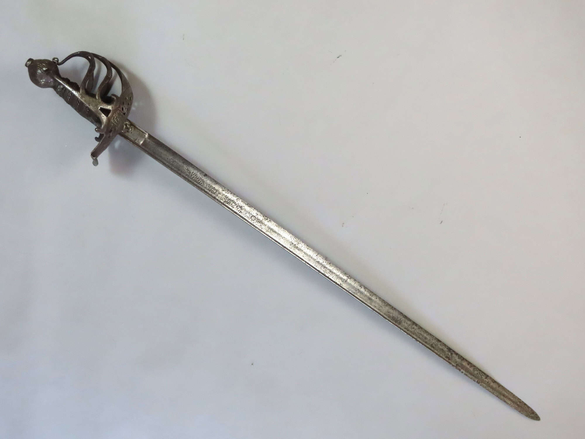 An attractive English “Mortuary” sword with a pierced and chased hilt dating to the middle part of the 17th century and the English Civil War and Protectorate periods.