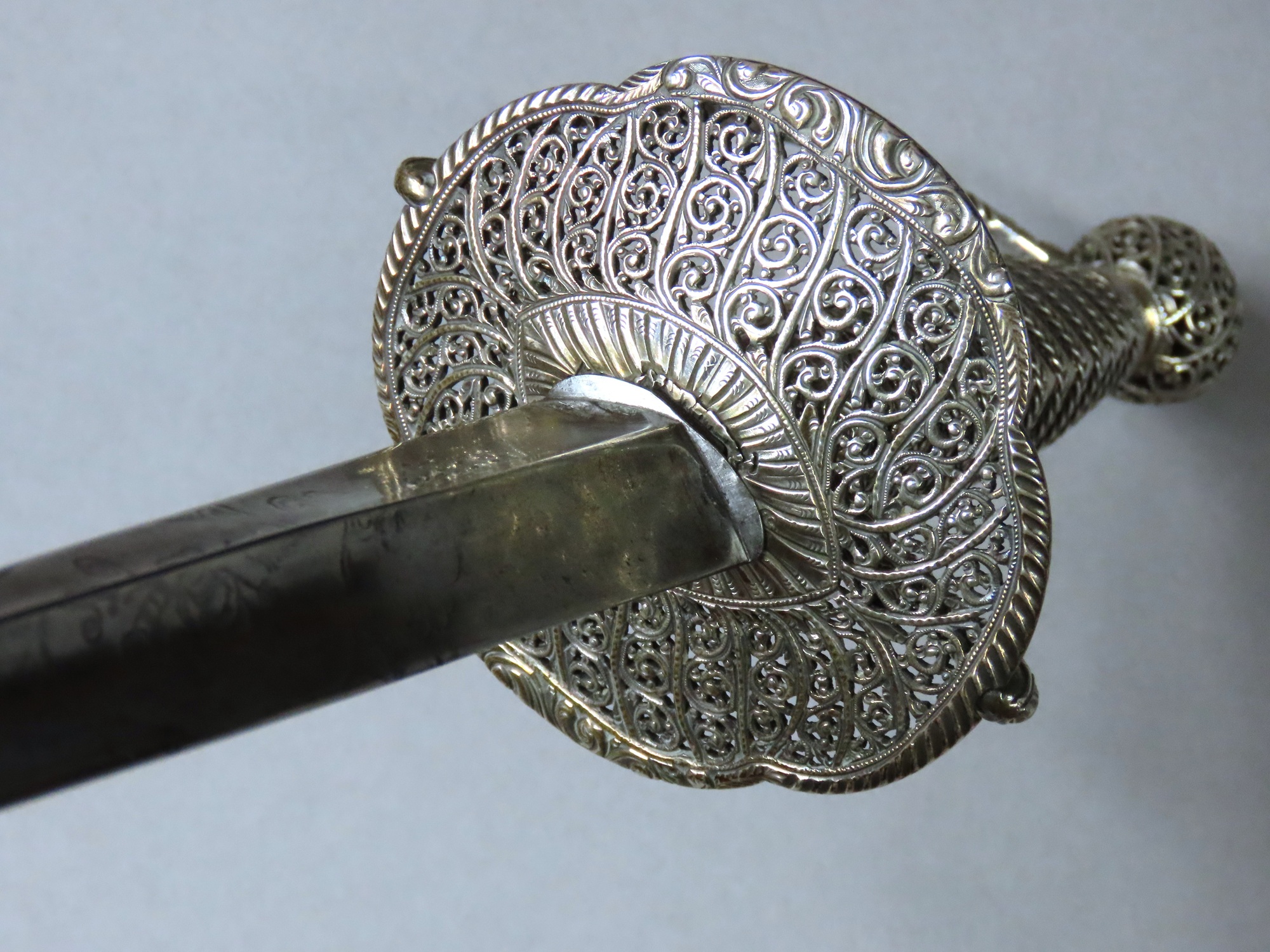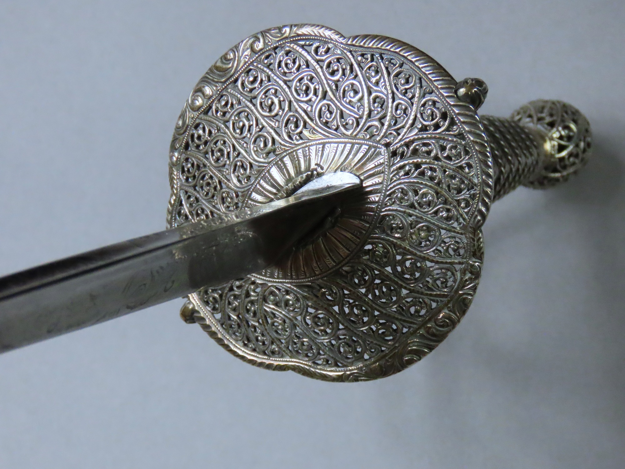 Kinman’s work, together with a few of his contemporaries, represents the highest standard of English silver craftsmanship of the time as is to be seen in the hilt of this sword. The dish guard, pommel and ricasso are pierced and engraved with exquisitely detailed foliate scrolls formed within diagonally spaced panels, the sides of which emulate waving tendrils. The delicacy of the interior of the dish guard is supported by a strengthening of the rim which is decorated with floral designs front and back with gadrooned engraving to the sides, which is repeated on the knuckle bow and quillons.