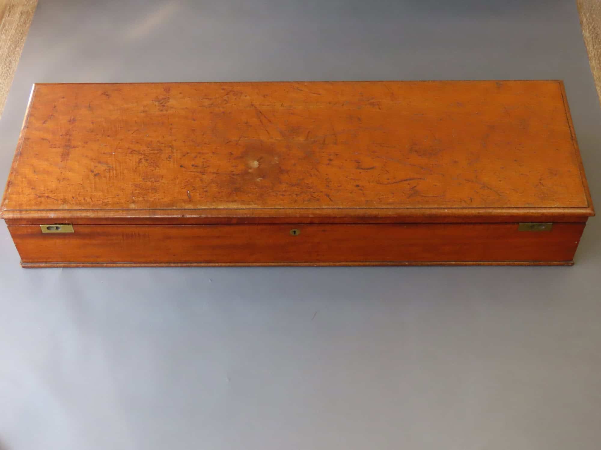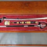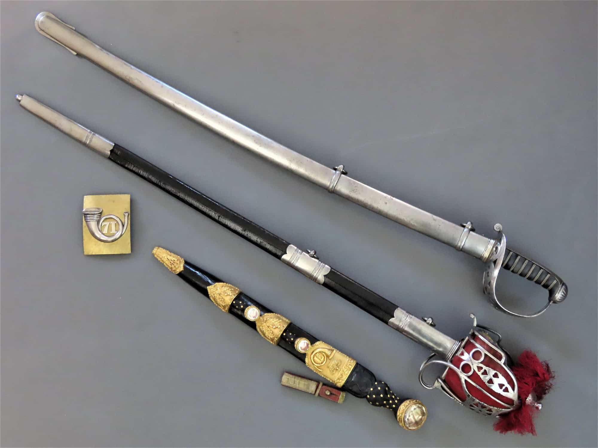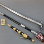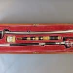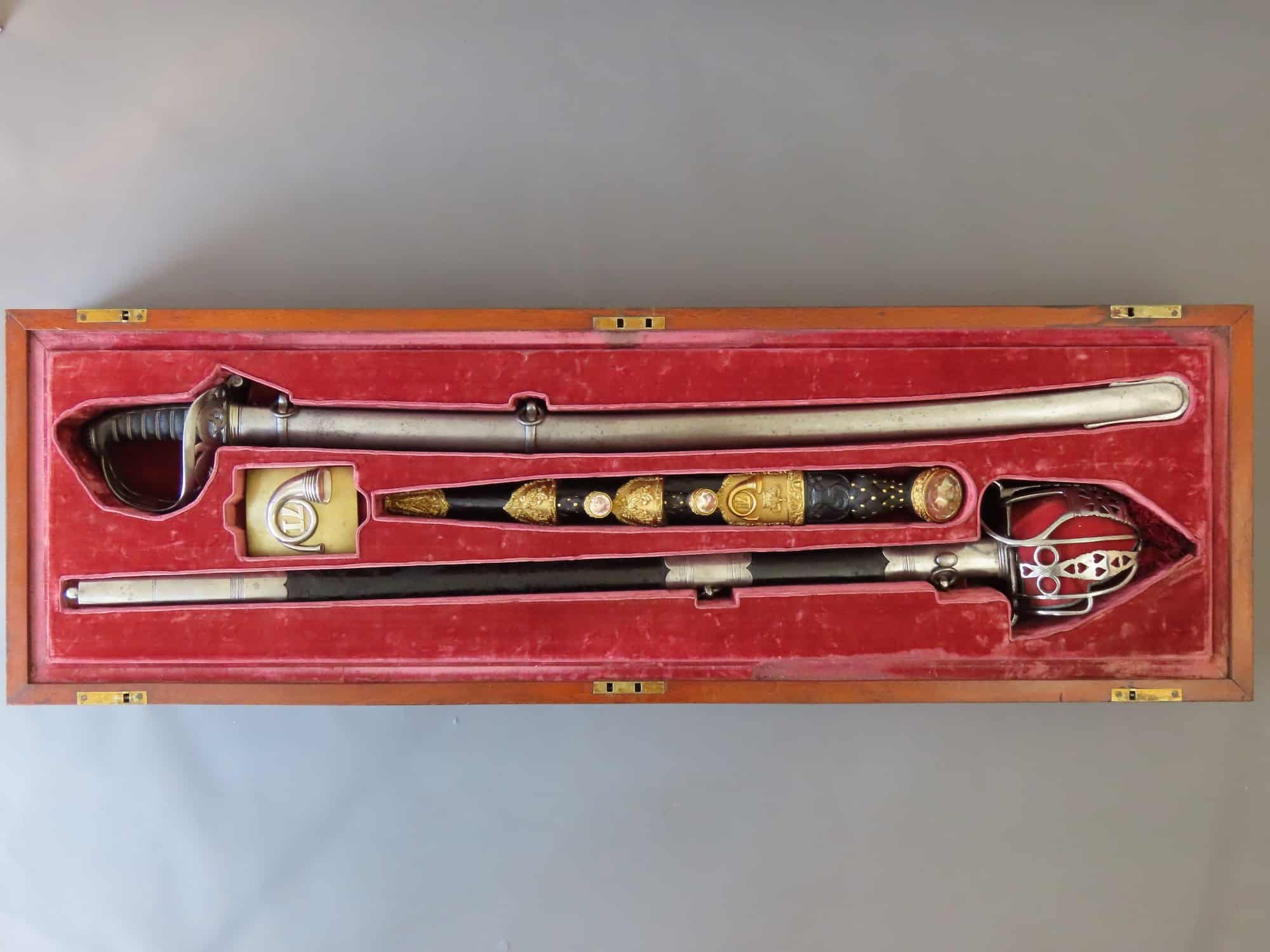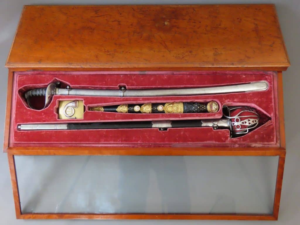 The set consists of Lt Neave’s dress basket hilted broadsword, his field service sword, dress dirk and shoulder belt plate, all notable for their excellent quality and fine condition. The set is contained in purpose built contemporary fitted mahogany case with two locks fitted to each side. When the top lid is lifted off a second glazed lid is revealed through which the items may be viewed. This can also be lifted off to access the items by hand which are seated in shaped hard lined apertures lined with plum coloured velvet.