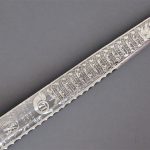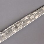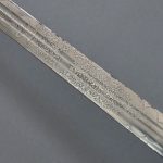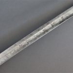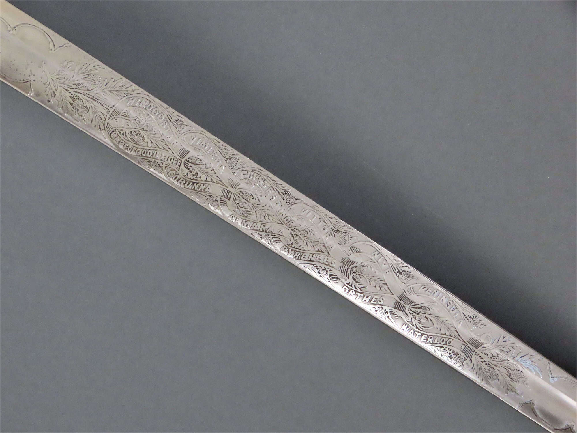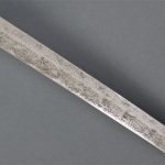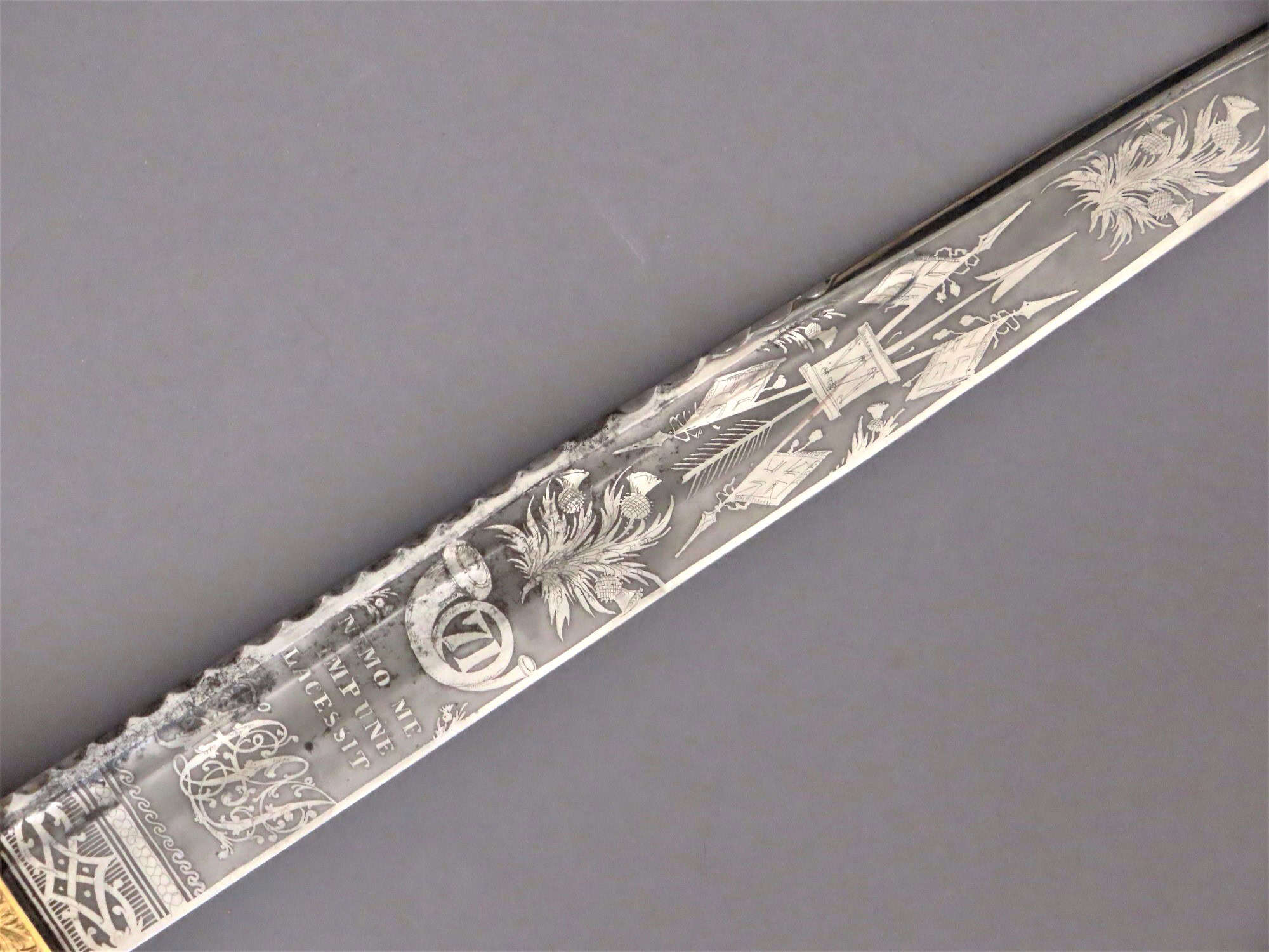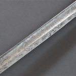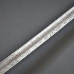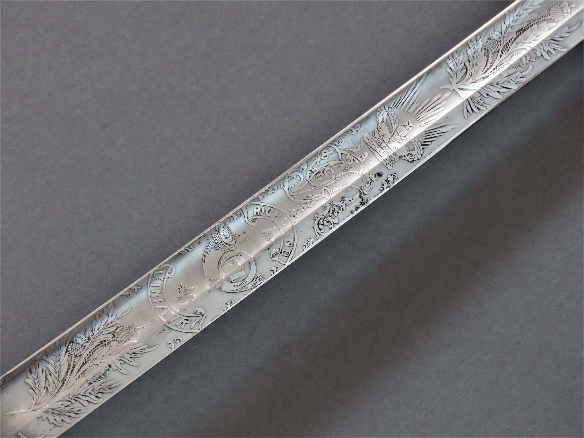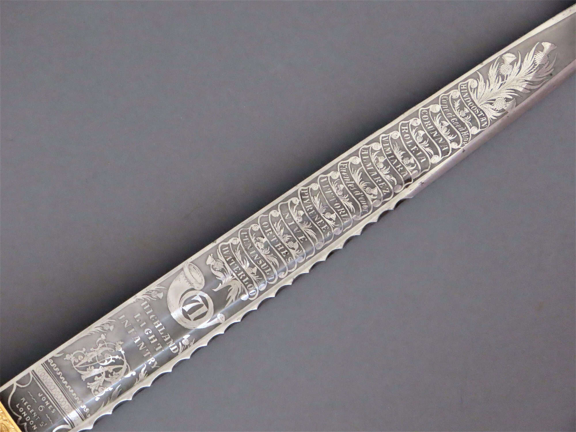 Viewed from the hilt towards the tip on one side, the blade is etched with a panel of bordered interlace above which in floral script are the letters “HLI” for the Highland Light Infantry. Above this the regimental motto “NEMO ME IMPUNE LACASSET” is clear. The next etched design is a bugle with “71” inside its loop with a thistle above, followed by a stand of arms, and a further thistle beyond.