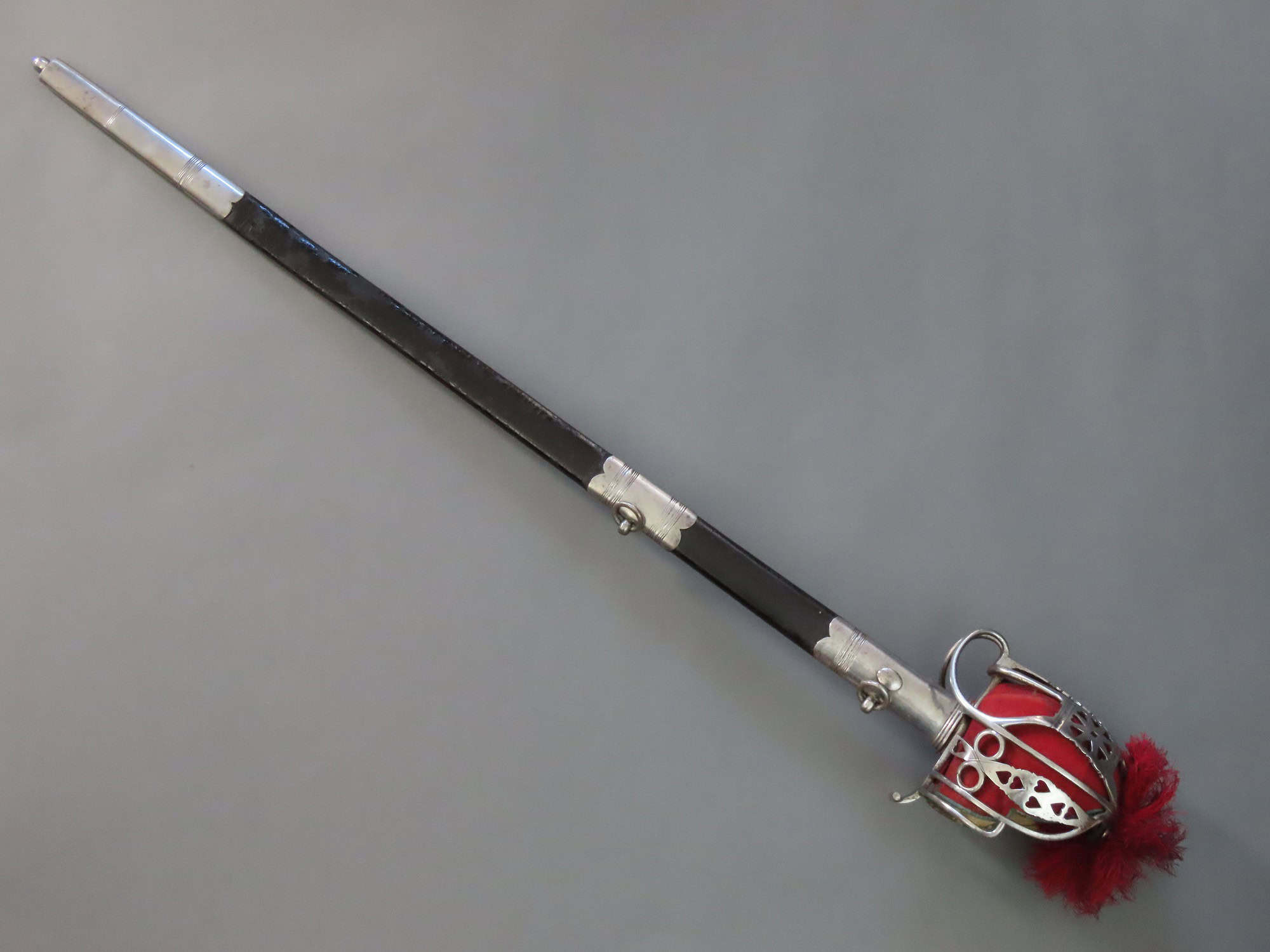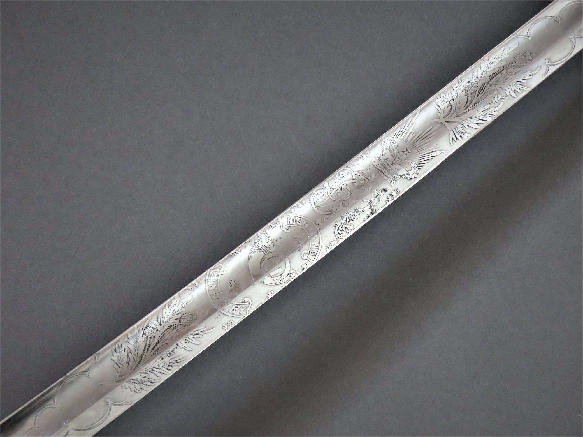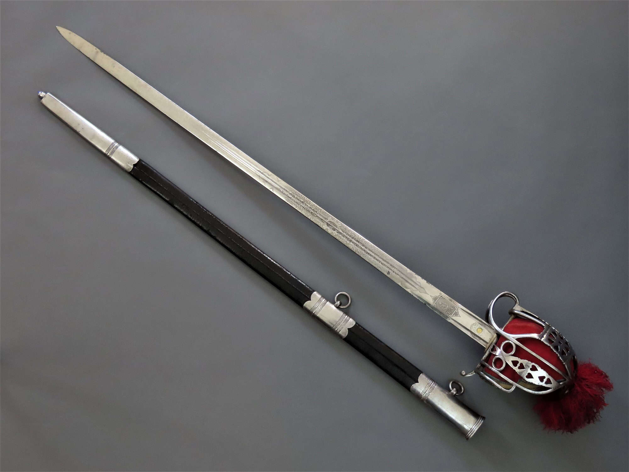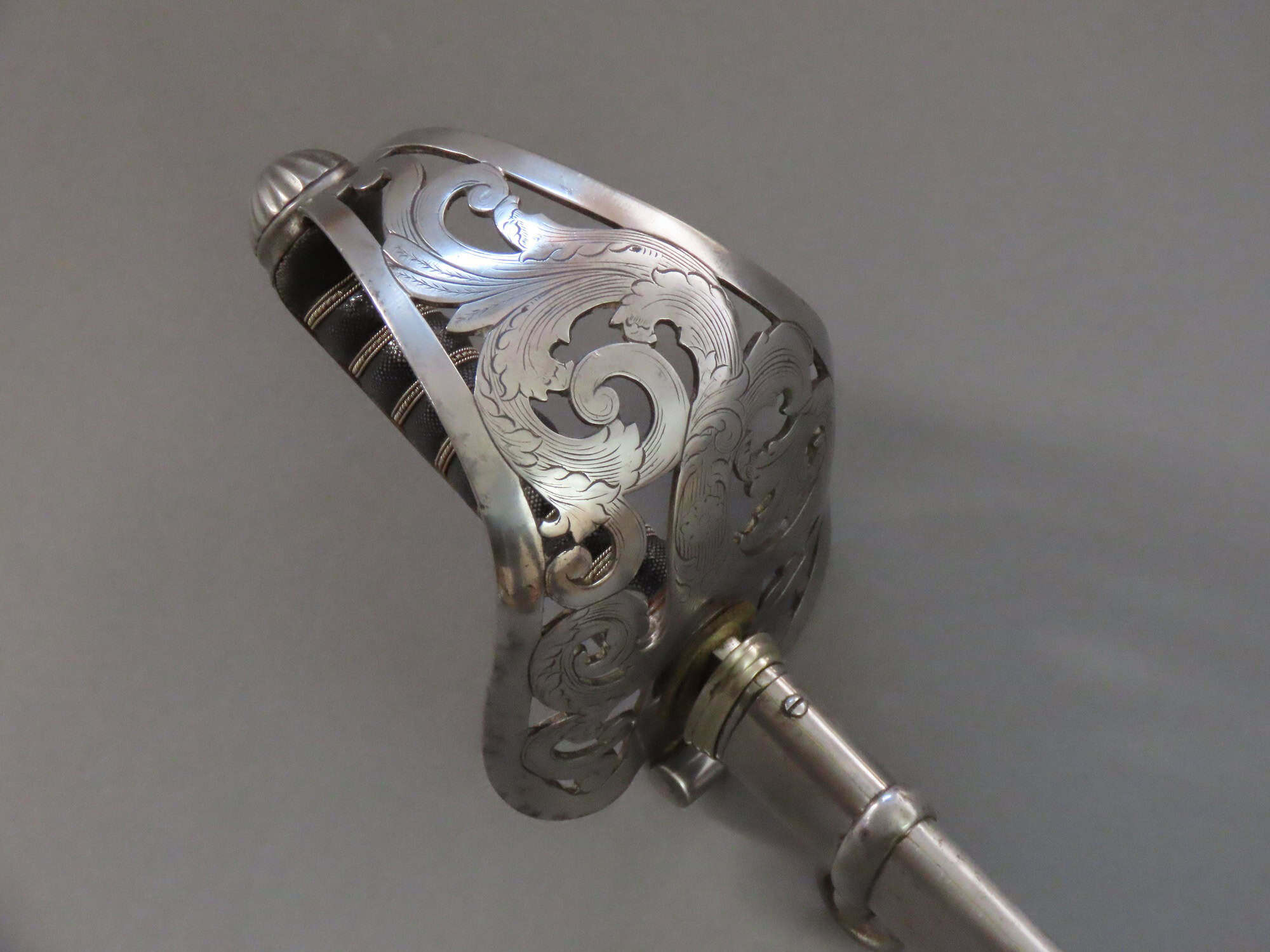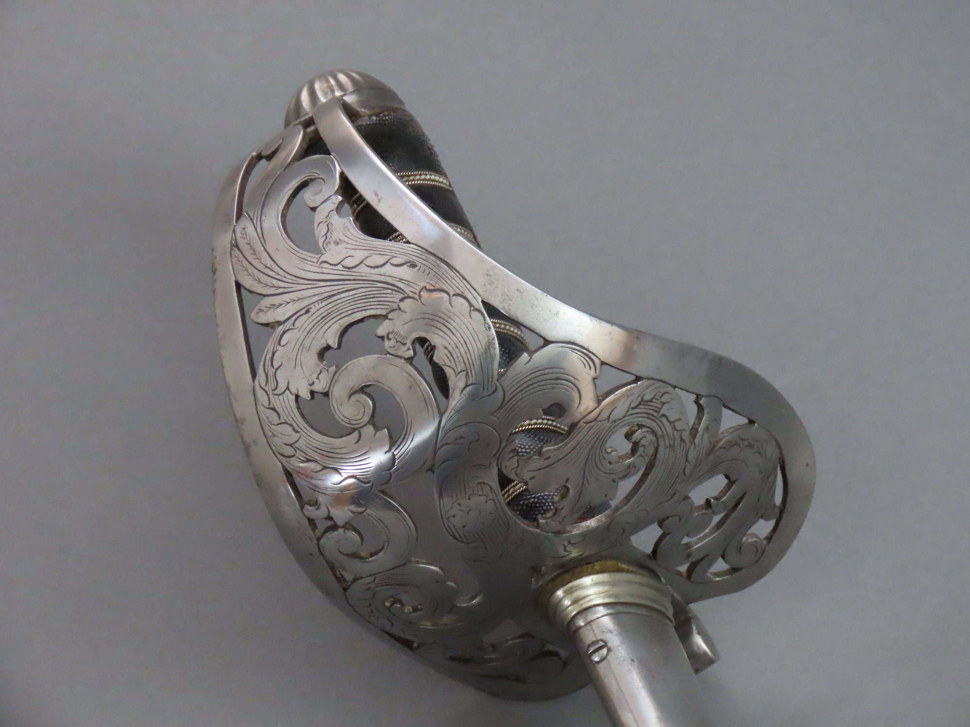 Further along on the same side is an elaborate foliate panel which contains the regimental emblem and the numerals “LXXI” for “71”. On the reverse side a similar foliate panel contains the “VR” cypher with a crown above. The regulation basket guard is pierced with hearts and circles, mounted with a fluted bun-shaped pommel with button, wooden spirally grooved grip covered with black shagreen bound with silver wire, and retaining its red fringe and scarlet cloth faced buff leather liner with blue silken hem. The sword retains its polished finish. The sword is contained in its black leather scabbard with three matching steel mounts with linear engraving, the top locket with suspension ring and frog stud and middle mount with suspension ring. The sword is in fine condition with a few insignificant age related blemishes.
