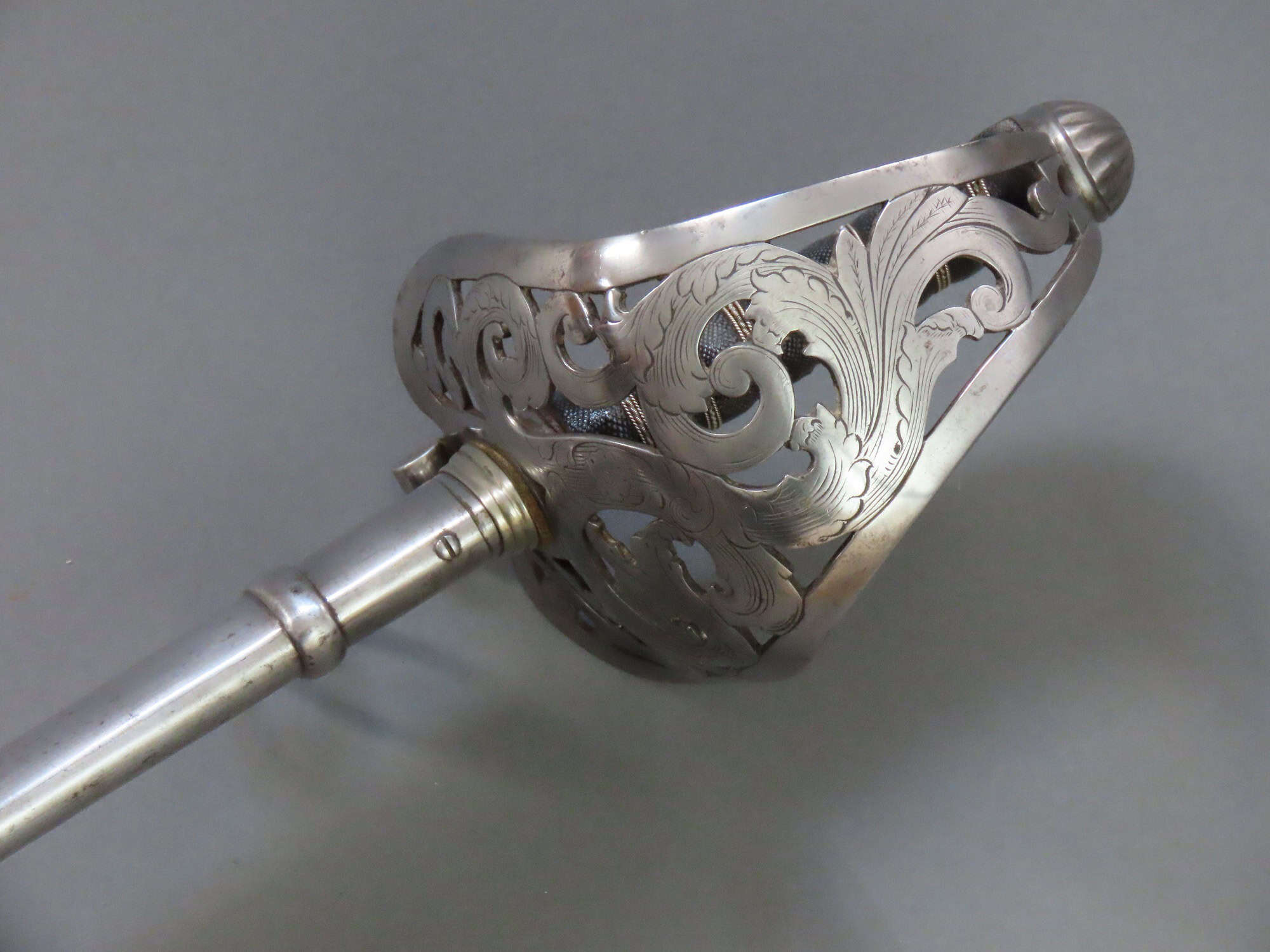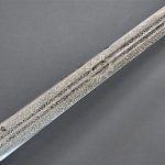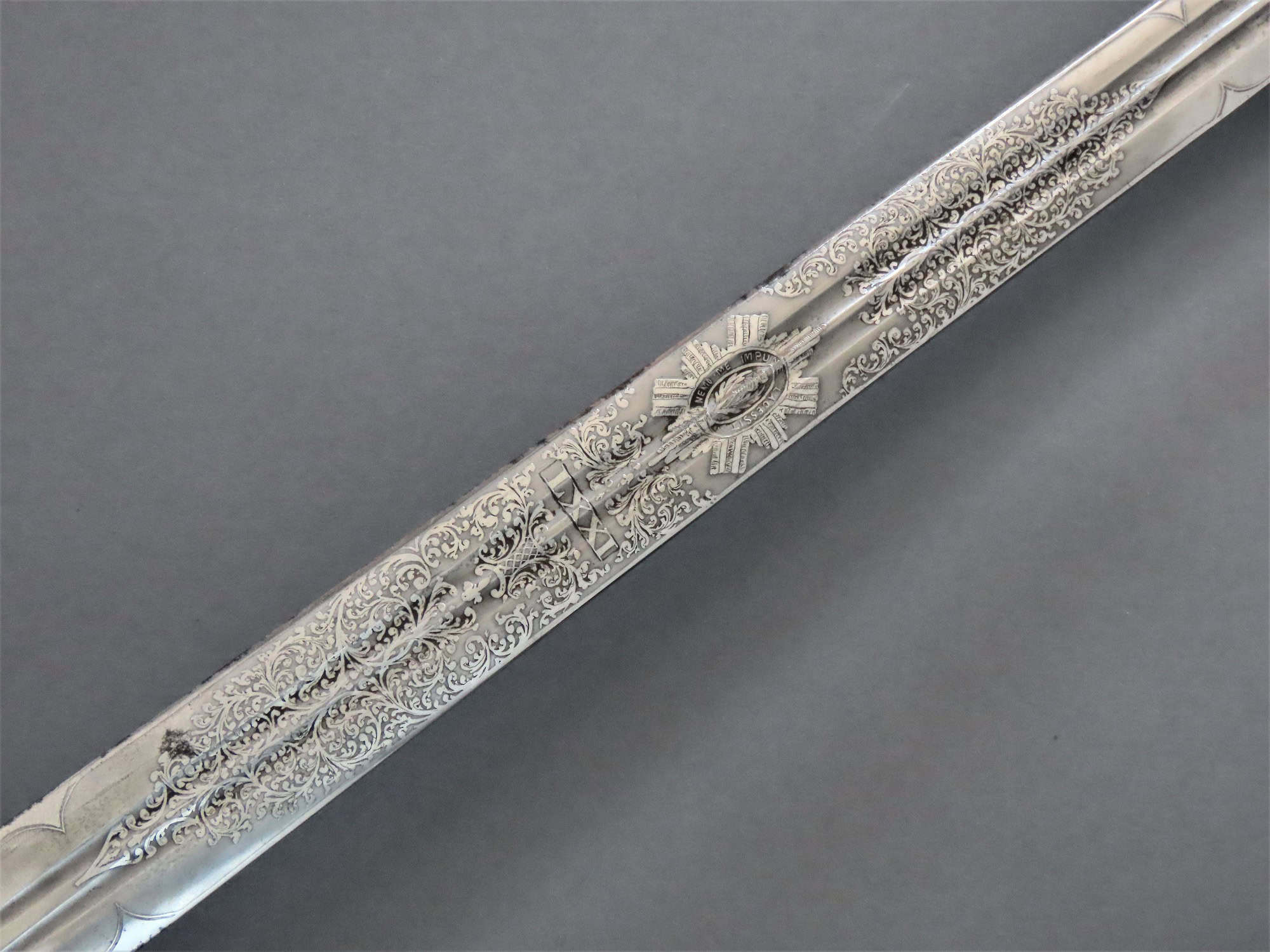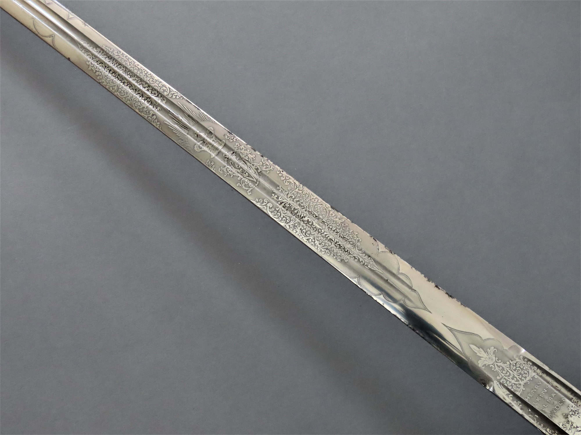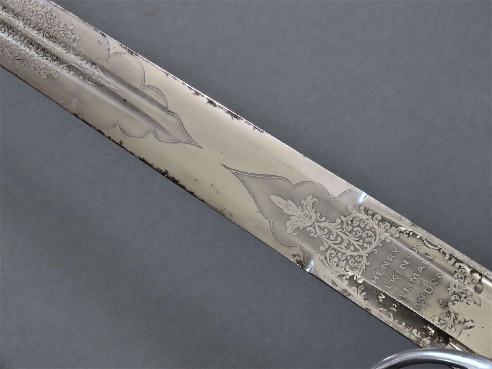 Further along on the same side is an elaborate foliate panel which contains the regimental emblem and the numerals “LXXI” for “71”. On the reverse side a similar foliate panel contains the “VR” cypher with a crown above. The regulation basket guard is pierced with hearts and circles, mounted with a fluted bun-shaped pommel with button, wooden spirally grooved grip covered with black shagreen bound with silver wire, and retaining its red fringe and scarlet cloth faced buff leather liner with blue silken hem. The sword retains its polished finish. The sword is contained in its black leather scabbard with three matching steel mounts with linear engraving, the top locket with suspension ring and frog stud and middle mount with suspension ring. The sword is in fine condition with a few insignificant age related blemishes.