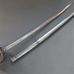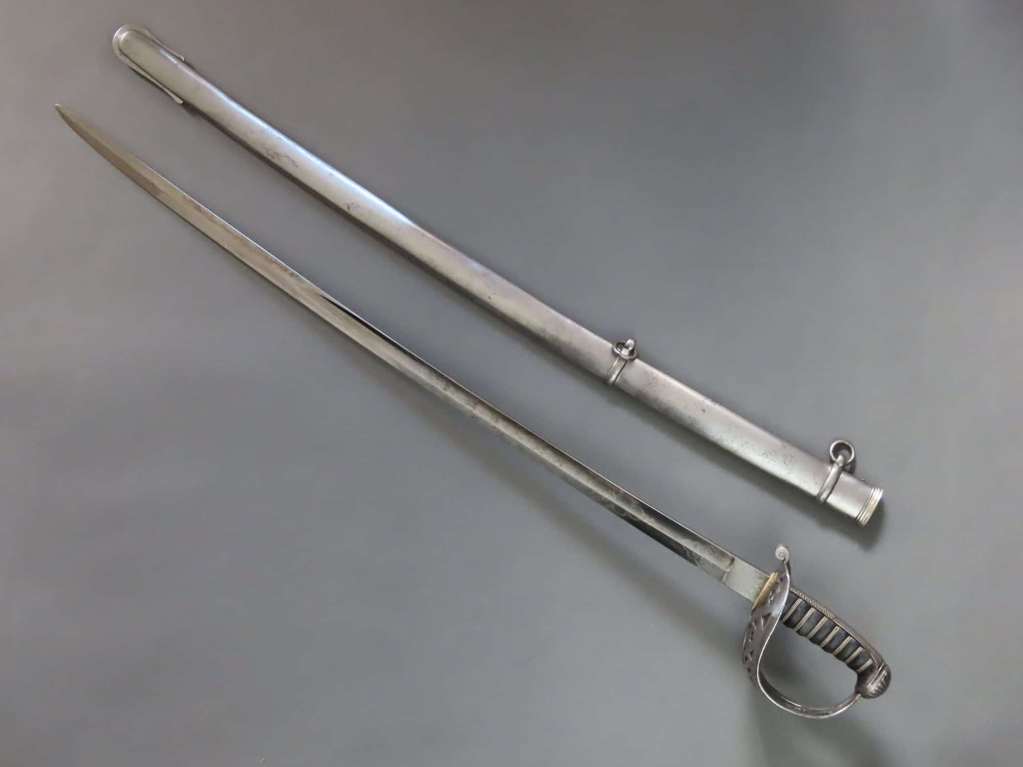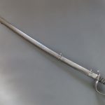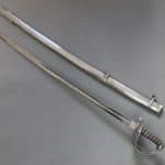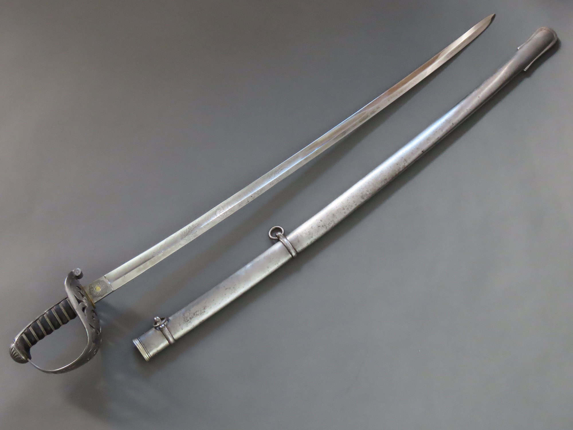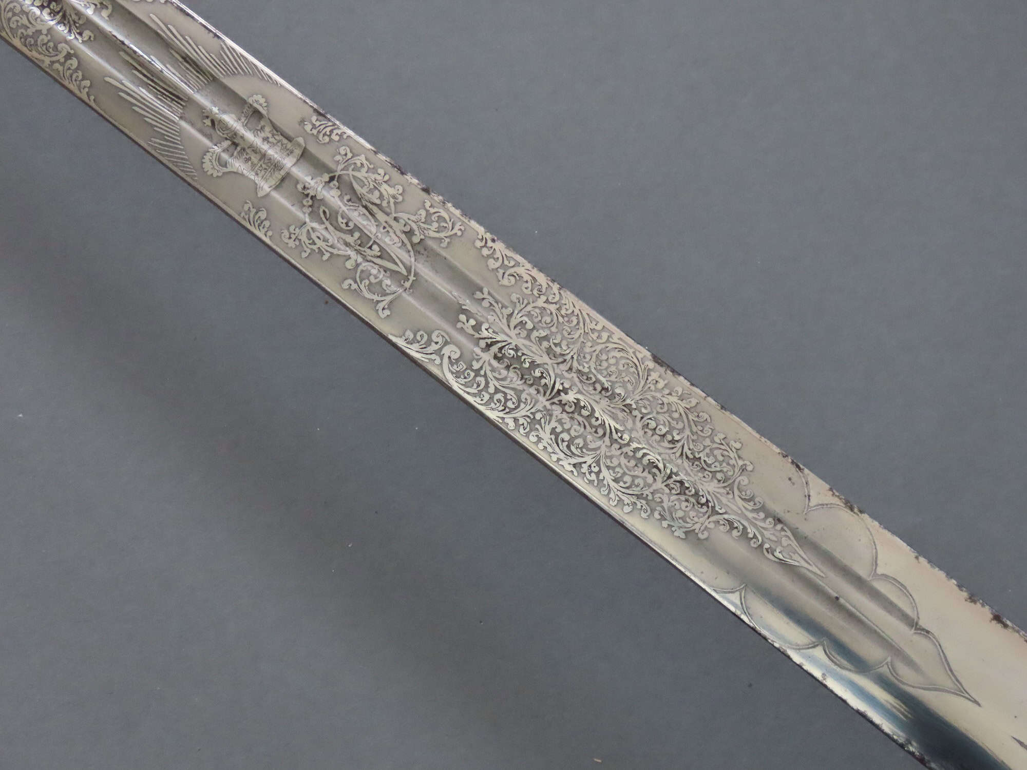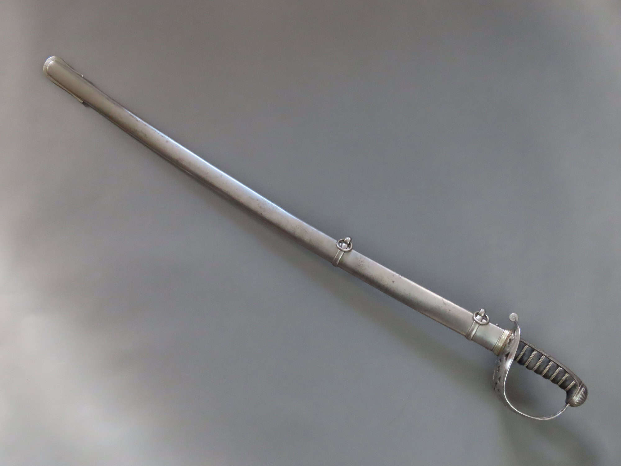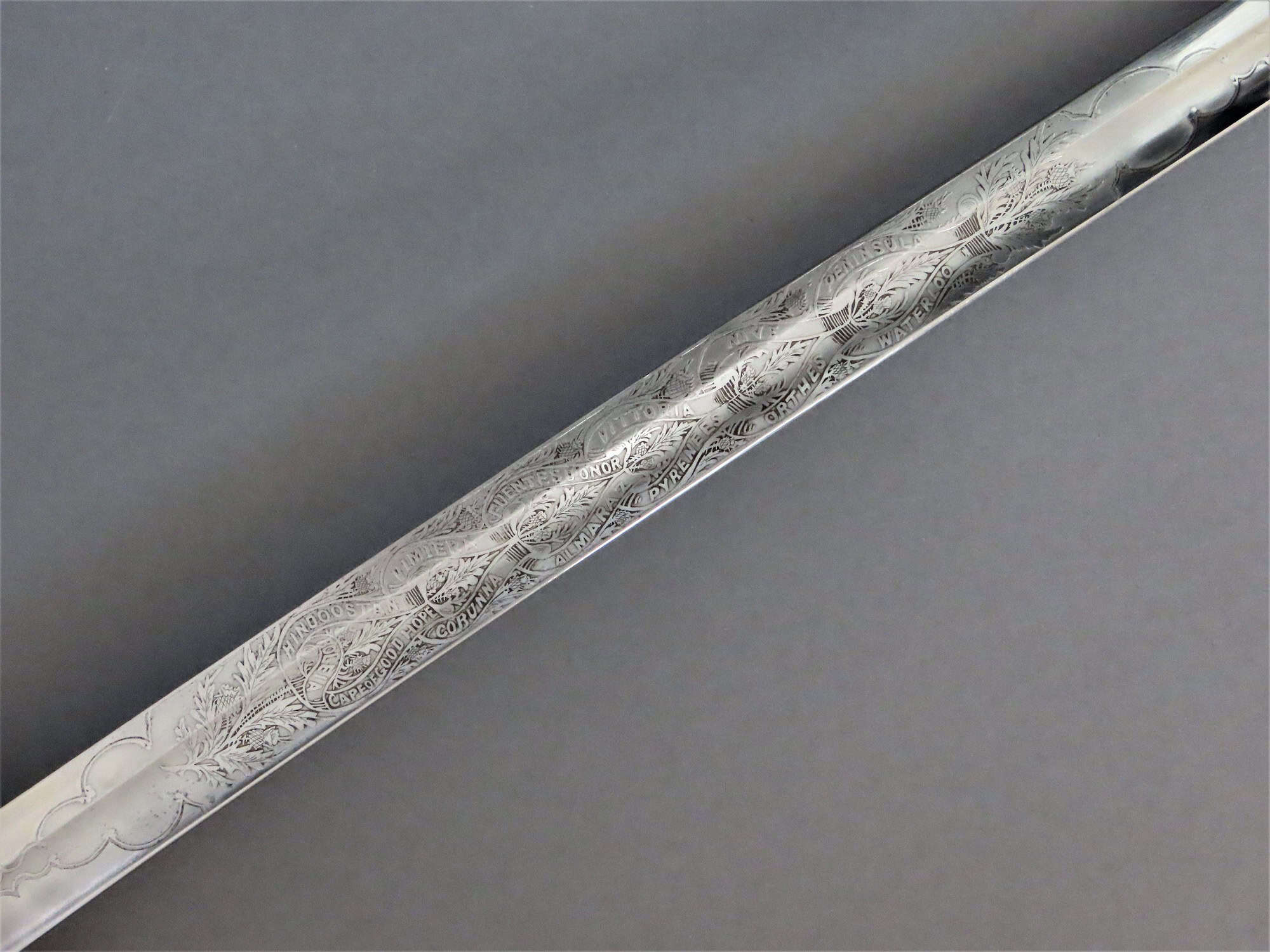 Further along on the same side is an elaborate foliate panel which contains the regimental emblem and the numerals “LXXI” for “71”. On the reverse side a similar foliate panel contains the “VR” cypher with a crown above. The regulation basket guard is pierced with hearts and circles, mounted with a fluted bun-shaped pommel with button, wooden spirally grooved grip covered with black shagreen bound with silver wire, and retaining its red fringe and scarlet cloth faced buff leather liner with blue silken hem. The sword retains its polished finish. The sword is contained in its black leather scabbard with three matching steel mounts with linear engraving, the top locket with suspension ring and frog stud and middle mount with suspension ring. The sword is in fine condition with a few insignificant age related blemishes.