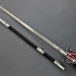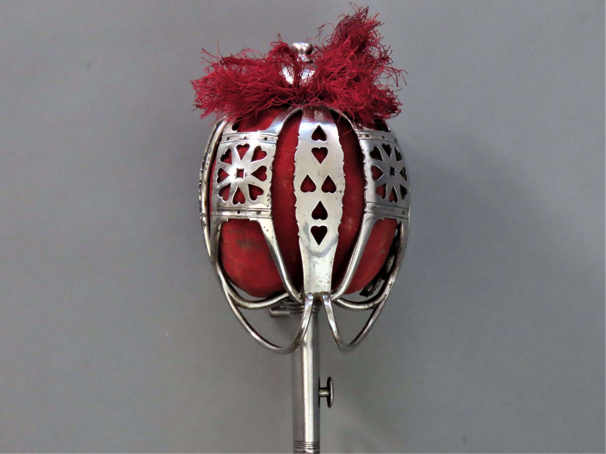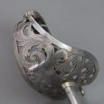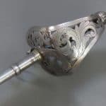 The steel hilt is mounted with a scrolled wrist guard and typically pierced with foliate designs and engraved with leaf-like scrolls. The pommel is domed and cut with radiating flutes. The wooden grip is covered with black shagreen, and bound with silver wire.