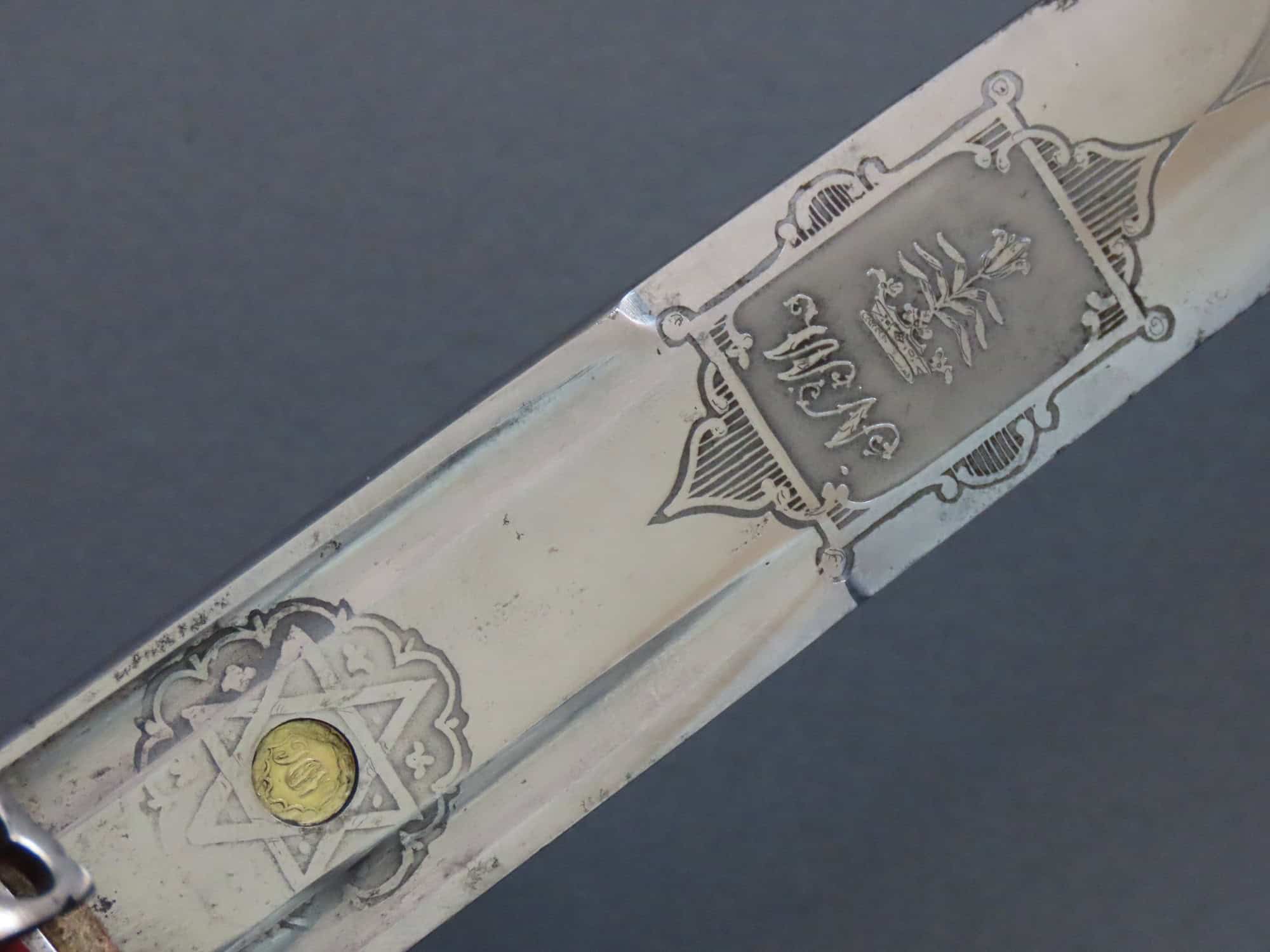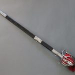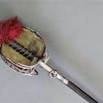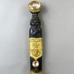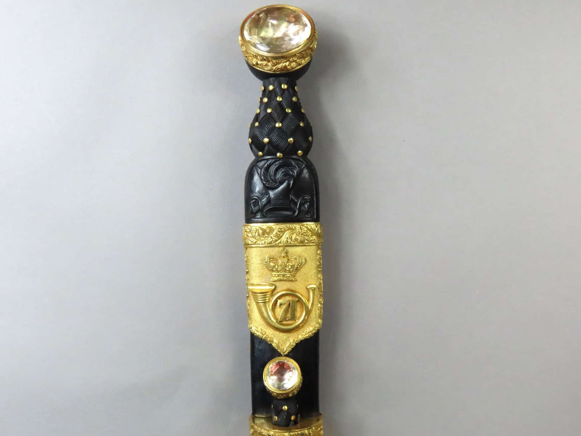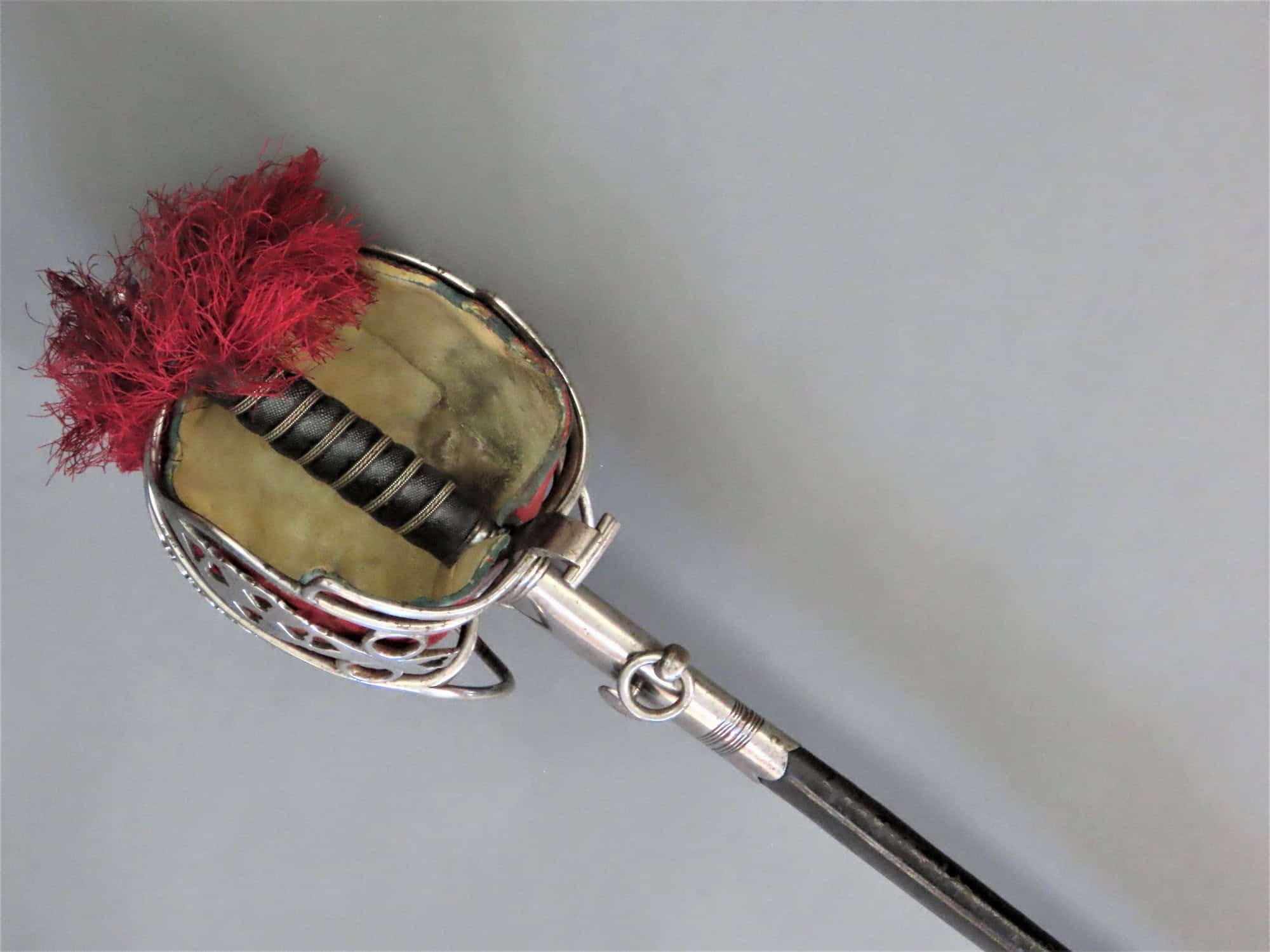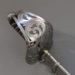 The Scottish basket hilted broad sword is by Henry Wilkinson and not numbered. Henry Wilkinson began their numbering system in 1854 which dates the production of this sword to circa 1848-1854. The regulation pattern straight blade is 32.25 inches (82cm) long and profusely etched with fine designs. The pronounced ricasso has a deep fuller near to each blunt edge and further along the blade two central fullers run in parallel. Inside the ricasso on one side is “HENRY WILKINSON, PALL MALL, LONDON” and on the reverse side a star shaped cartouche with a brass stud inside stamped with “HW” for Henry Wilkinson in raised relief. Just beyond the ricasso on the same side is an ornate cartouche with the owners initials “WN” and crest.