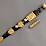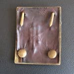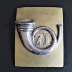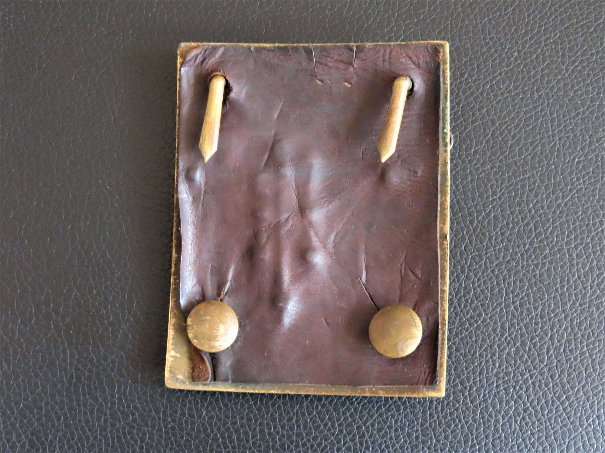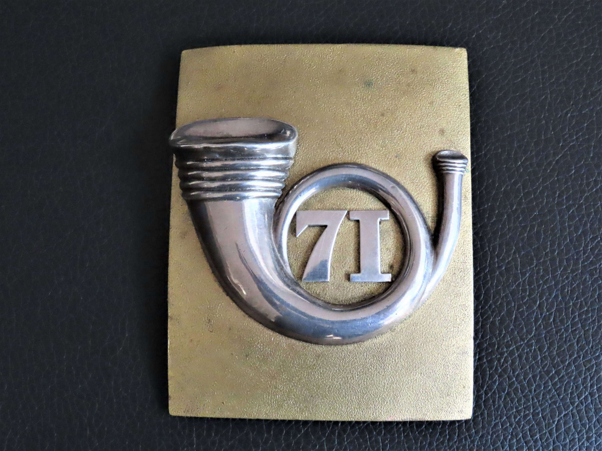 A shoulder-belt plate for an officer of the 71st is also accommodated in the case. This has a copper-gilt stippled ground with the silver applied regimental device of “71” within a bugle loop. It retains its hook, stud fittings on the reverse and its original leather backing.