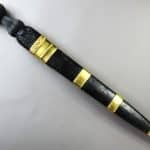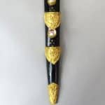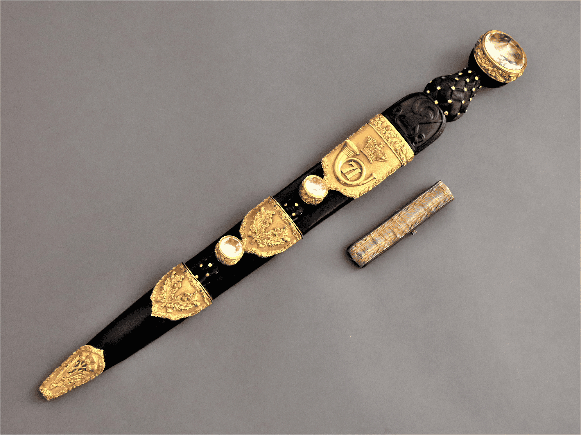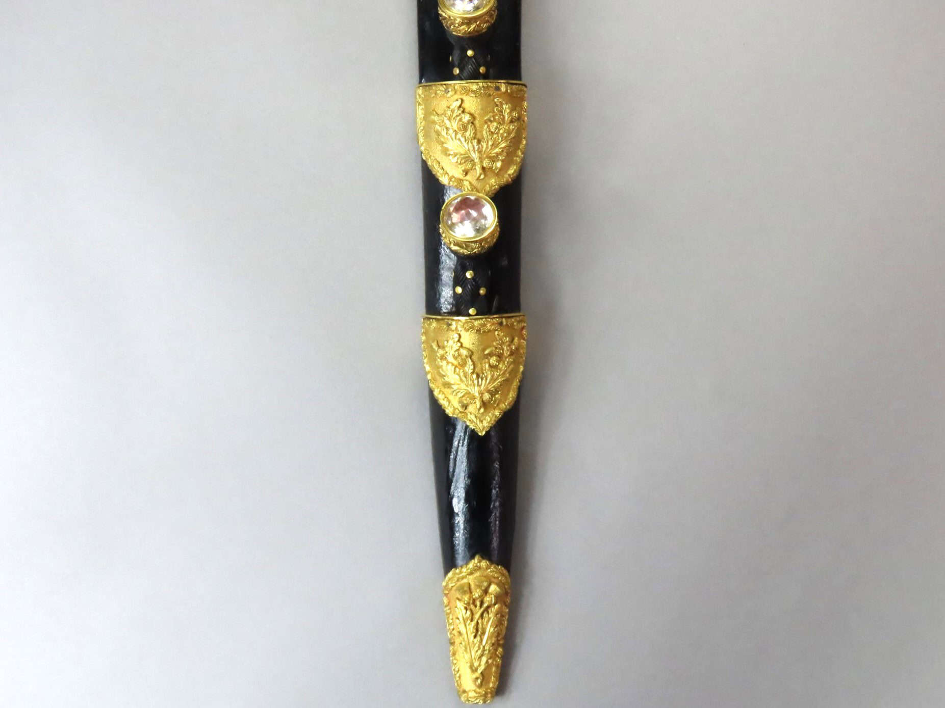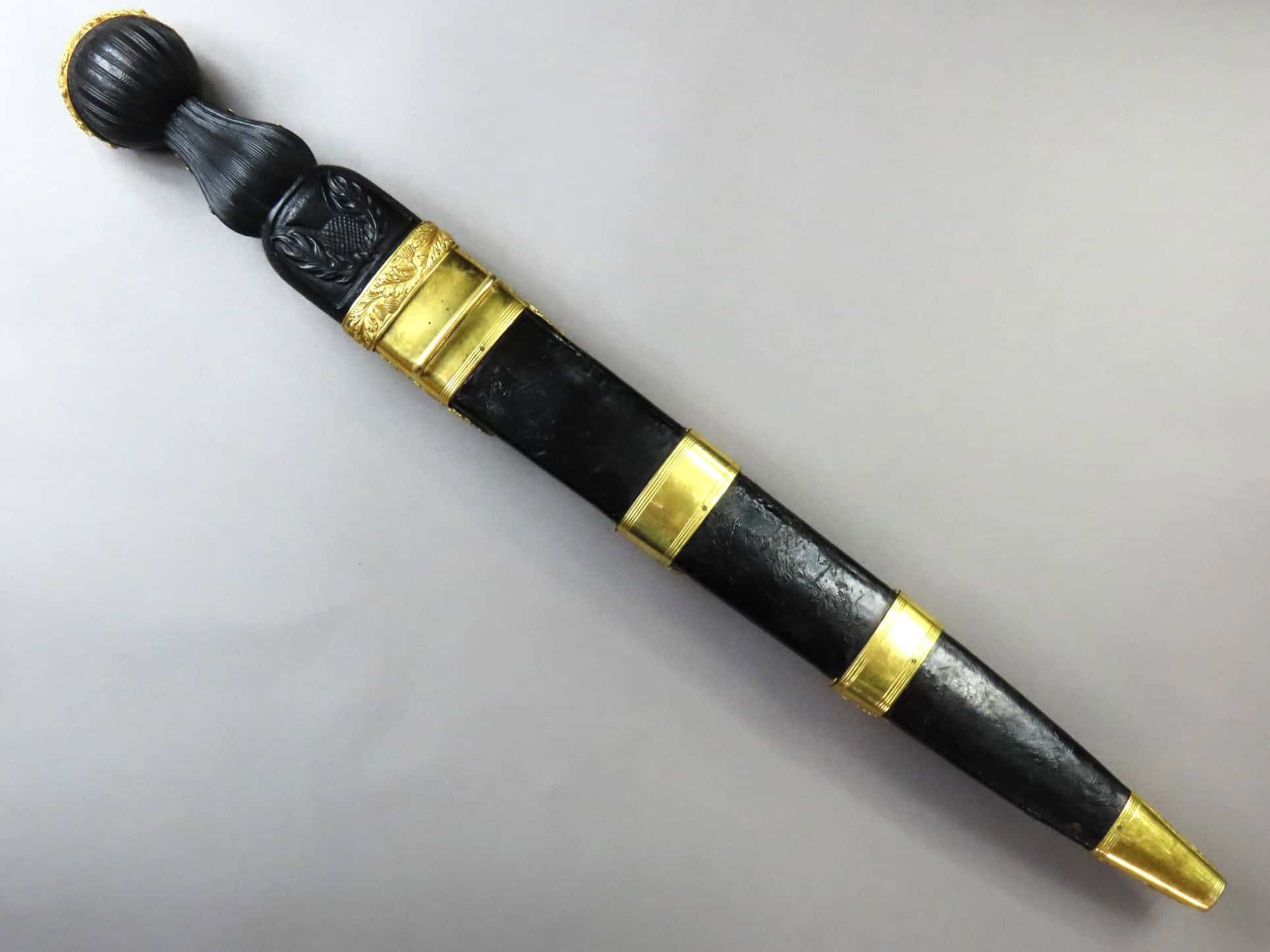 The dress dirk is exceptional and of robust size mounted with ebony grip and deeply chased Ormolu mounts. The leaf shaped blade measures just over 13 inches (just over 33 cm) and the dirk 19 inches overall length (just over 48 cm). It measures just under 20.5 inches (52 cm) when measured end to end in its scabbard. The baluster shaped dirk grip is cut with a Scottish military bonnet and crossed swords between the haunches to the front and with a thistle on the reverse in raised relief. The middle section is cut with a decorative basket weave pattern highlighted with gilt brass studs at the intersections at the front and with ridges of longitudinal lines to the rear which extend upwards to the back of the canted pommel. The pommel band and mouthpiece are of cast brass with a flowing band of thistles and leaves in raised relief.