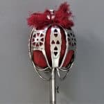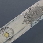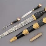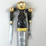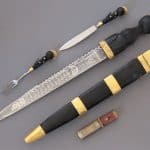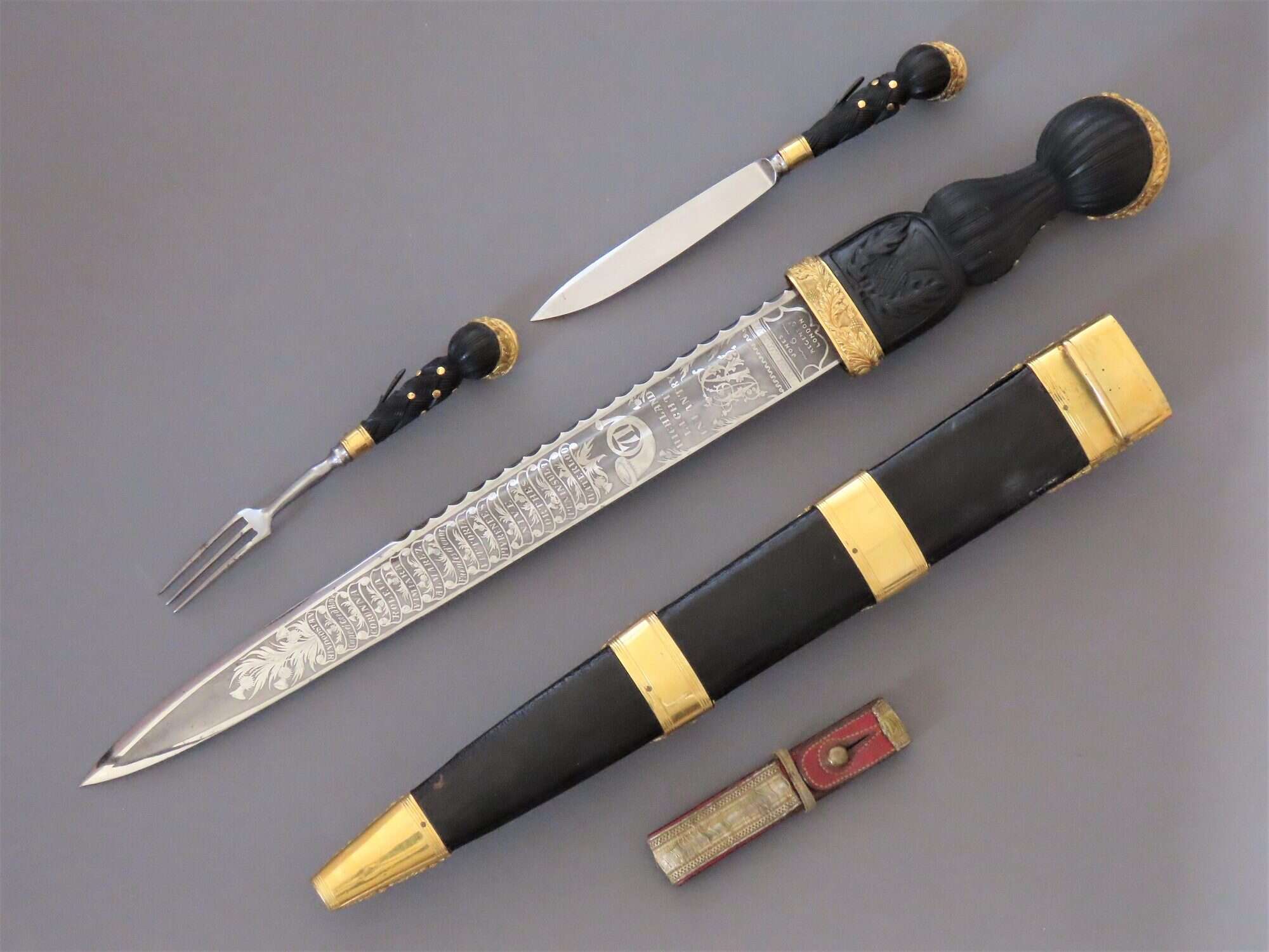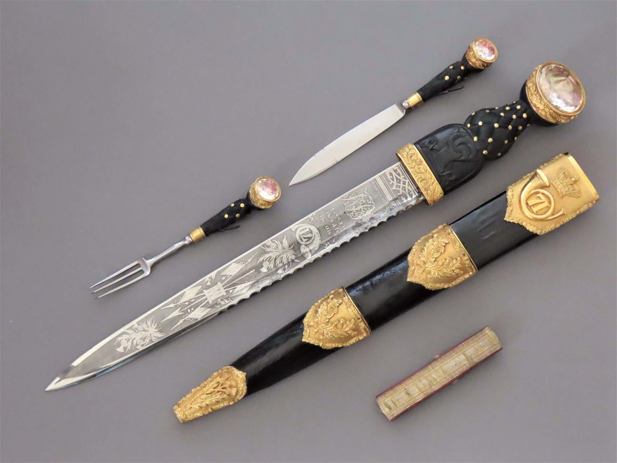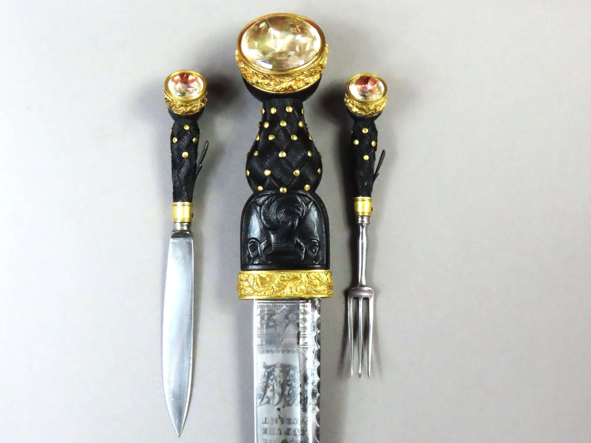 The grips of the knife and fork are cut with basket weave all over with studs at the intersections. The pommels are canted and the bands are of similar form to the dirk. At the base of the knife and fork grips a tapering ferrule holds in place a blued clip of sprung steel which holds in place each item when sheathed. The dirk, knife and fork are mounted with pommel stones cut in a multi-faceted manner around the edges with flat tops and a slight rose pink hue in background colour. The black patent leather scabbard mouthpiece is mounted with a bugle with “71” inside the loop and a crown above. The front of the knife mouthpiece, the fork mouthpiece, and the chape are mounted with thistles in raised relief.