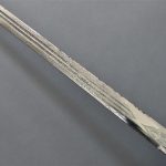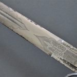The blade is scalloped along its back edge for over half its length after which it is double edged. A deep fuller runs underneath this part of the blade for the same length, and underneath this a wider, shallower fuller extends for the same length along each side.