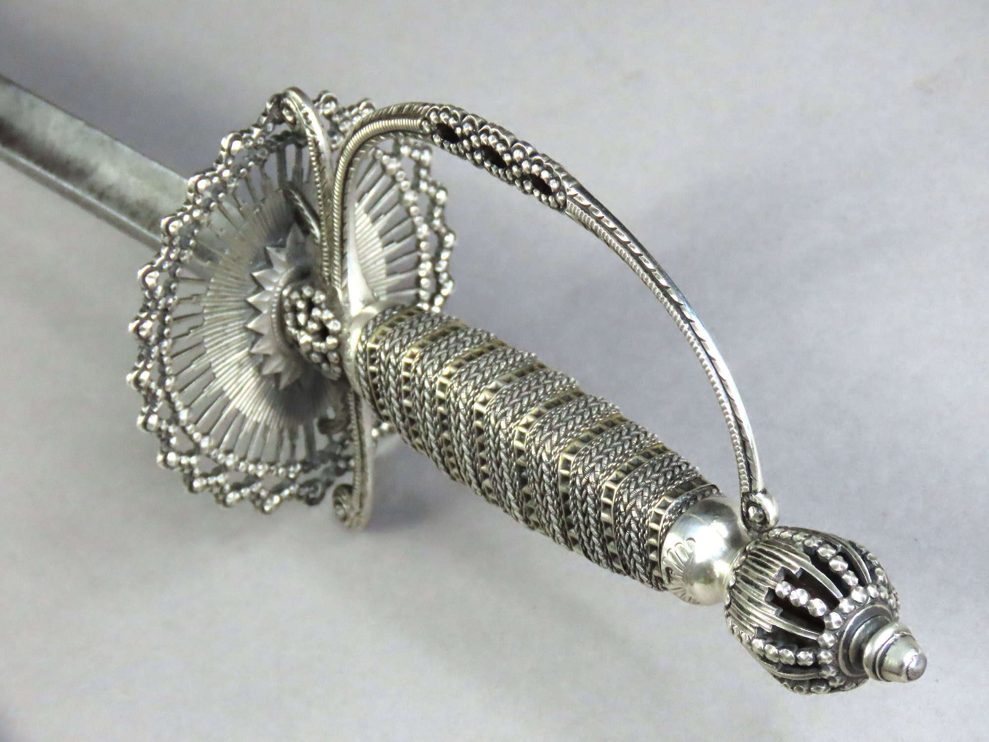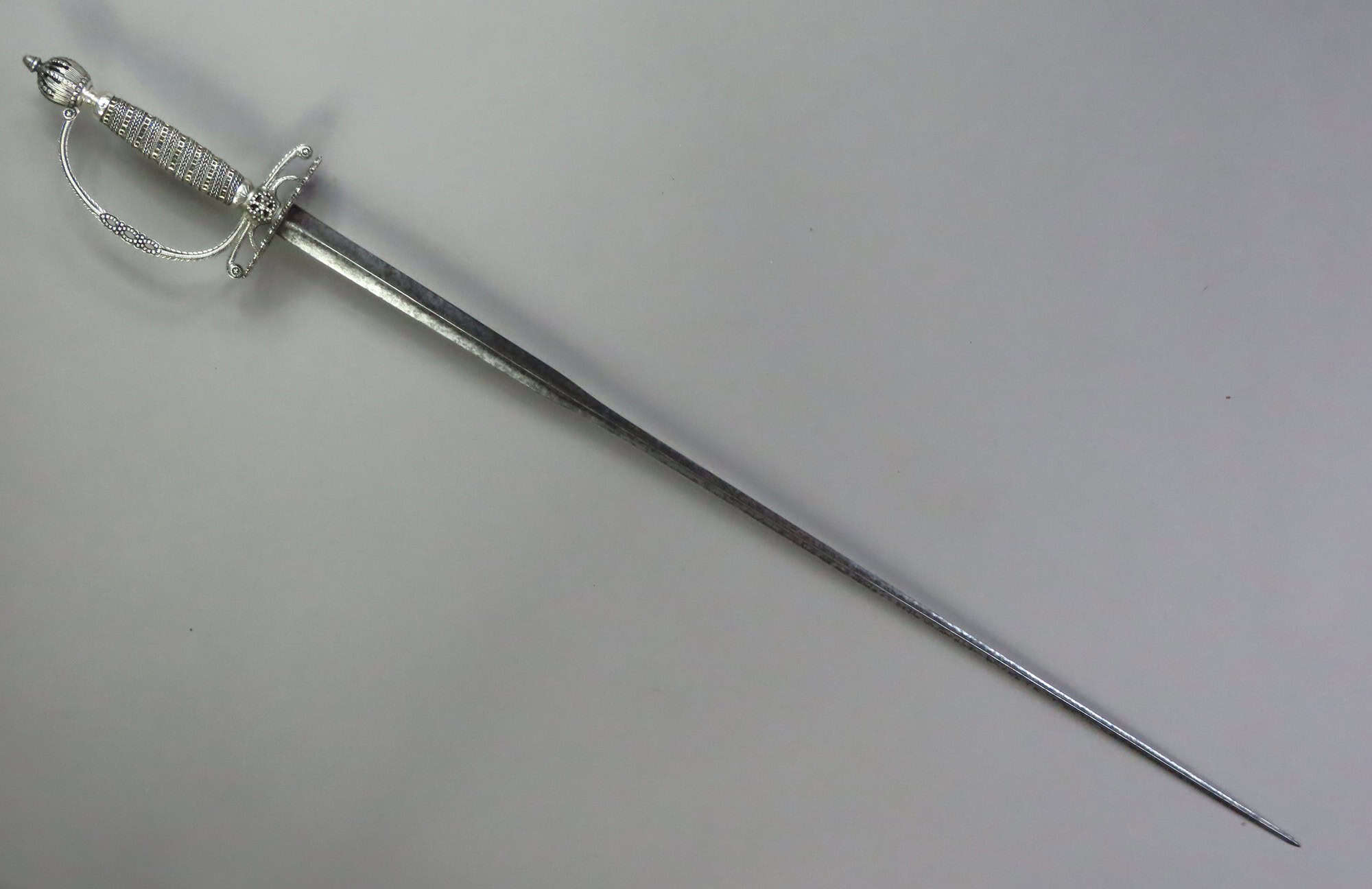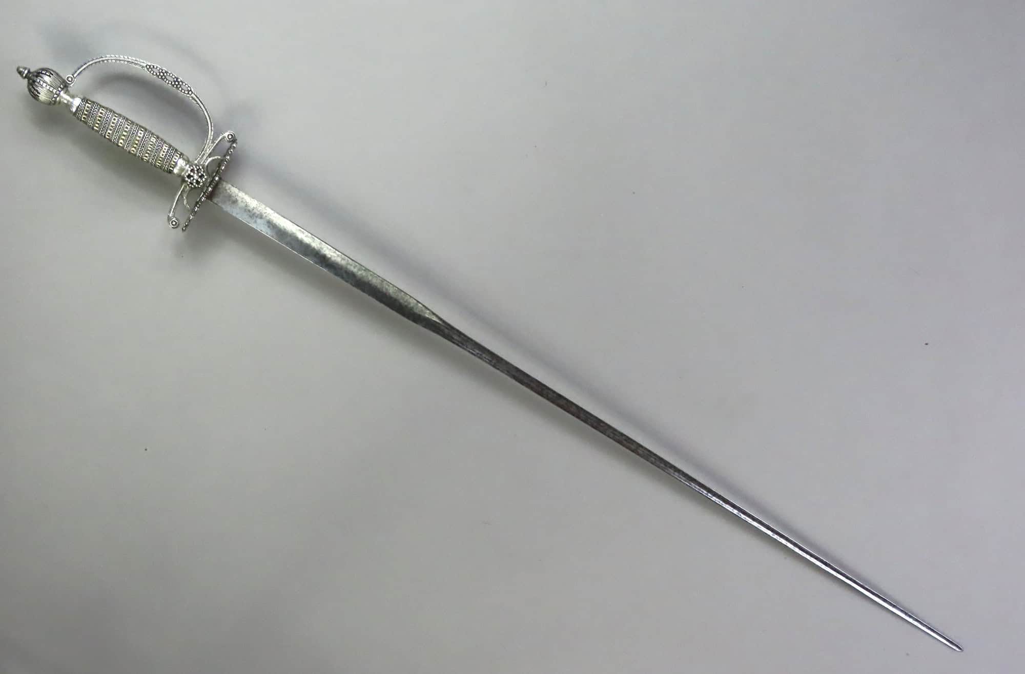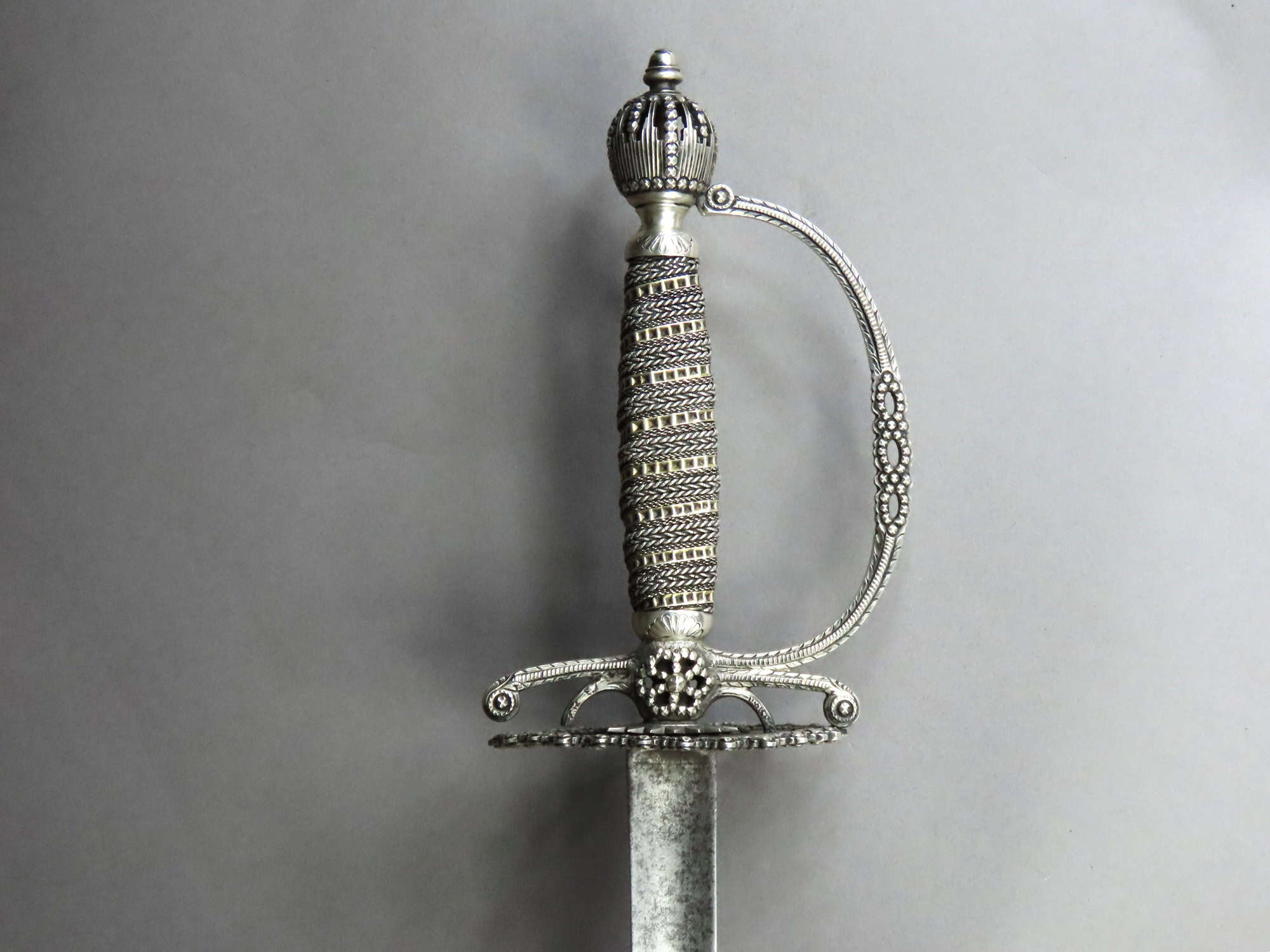 The baluster shaped wooden grip is of rounded rectangular section diagonally bound with contra twisted ropes of silver wire of different thicknesses separated by crimped silver ribbon. It is mounted with silver cap terminals top and bottom engraved with clam shells. The stiff, slender, triangular section, hollow ground, colichemarde blade is deceptively robust.