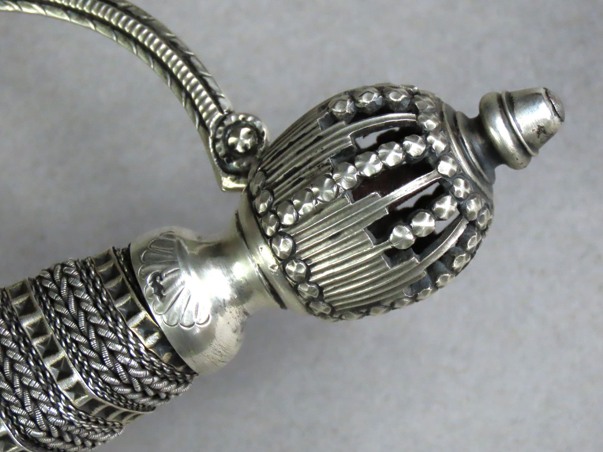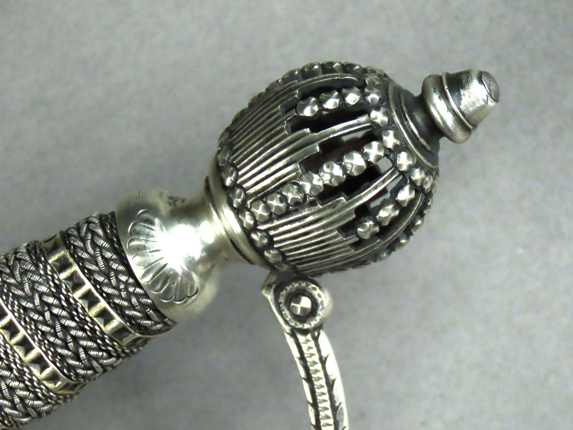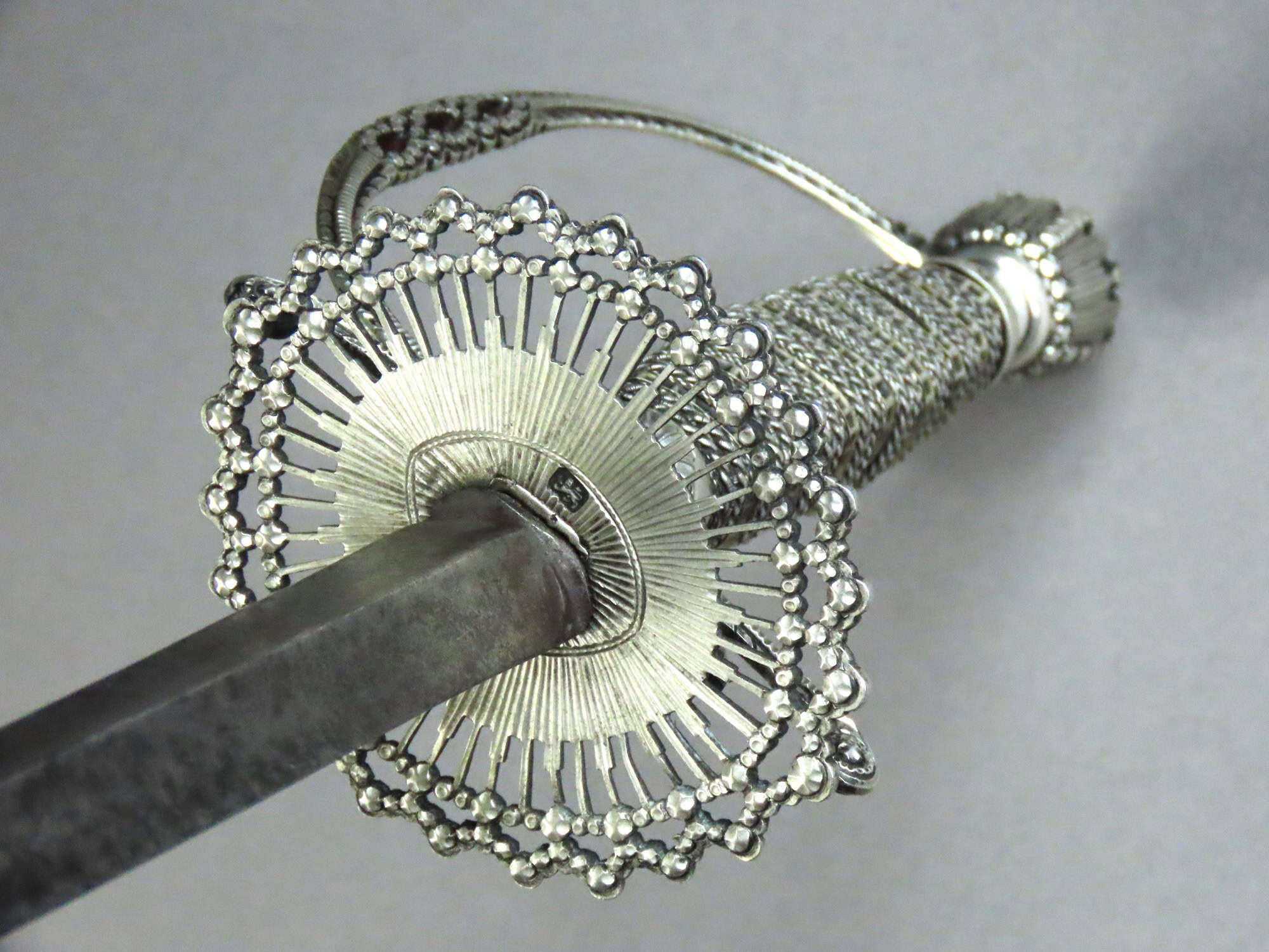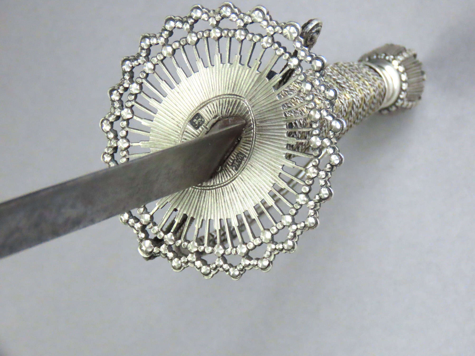 The baluster shaped wooden grip is of rounded rectangular section diagonally bound with contra twisted ropes of silver wire of different thicknesses separated by crimped silver ribbon. It is mounted with silver cap terminals top and bottom engraved with clam shells. The stiff, slender, triangular section, hollow ground, colichemarde blade is deceptively robust.