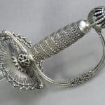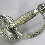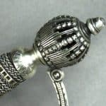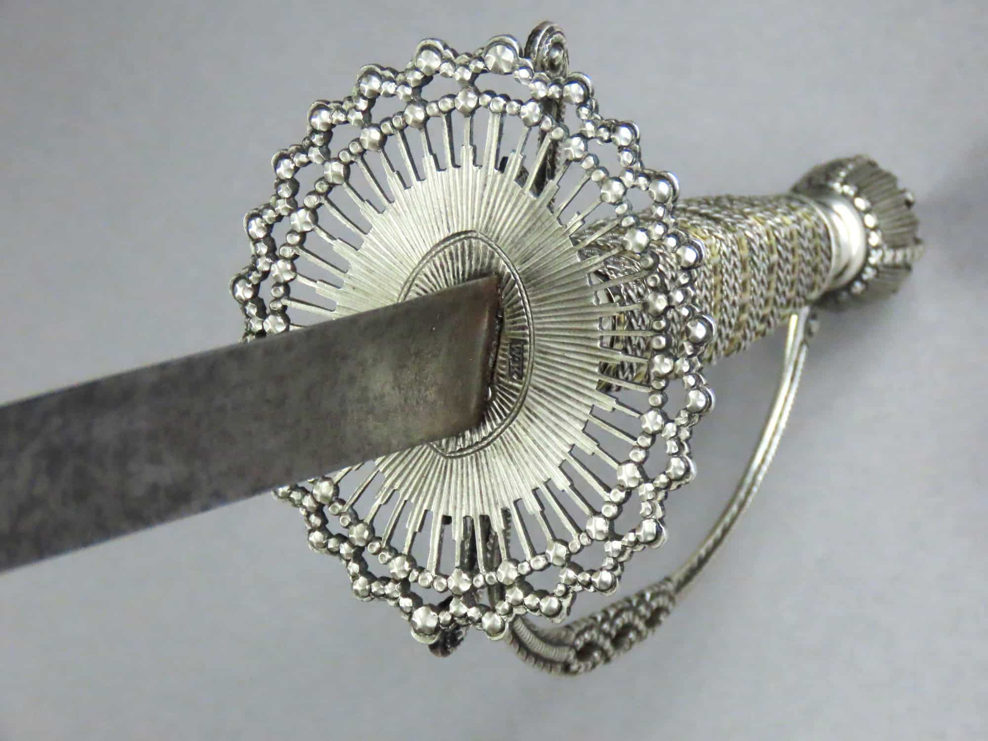 The sword is in fine condition overall. There are no losses or repairs to the hilt which has maintained its original pleasing outline. The blade has some shallow “salt and pepper” pitting which is more than offset by the outstanding quality of the hilt.