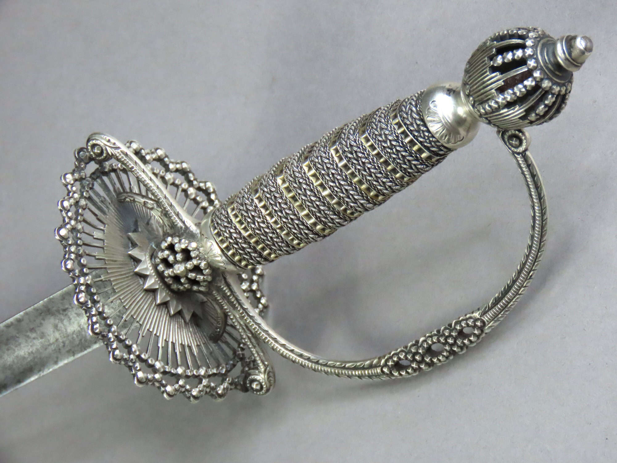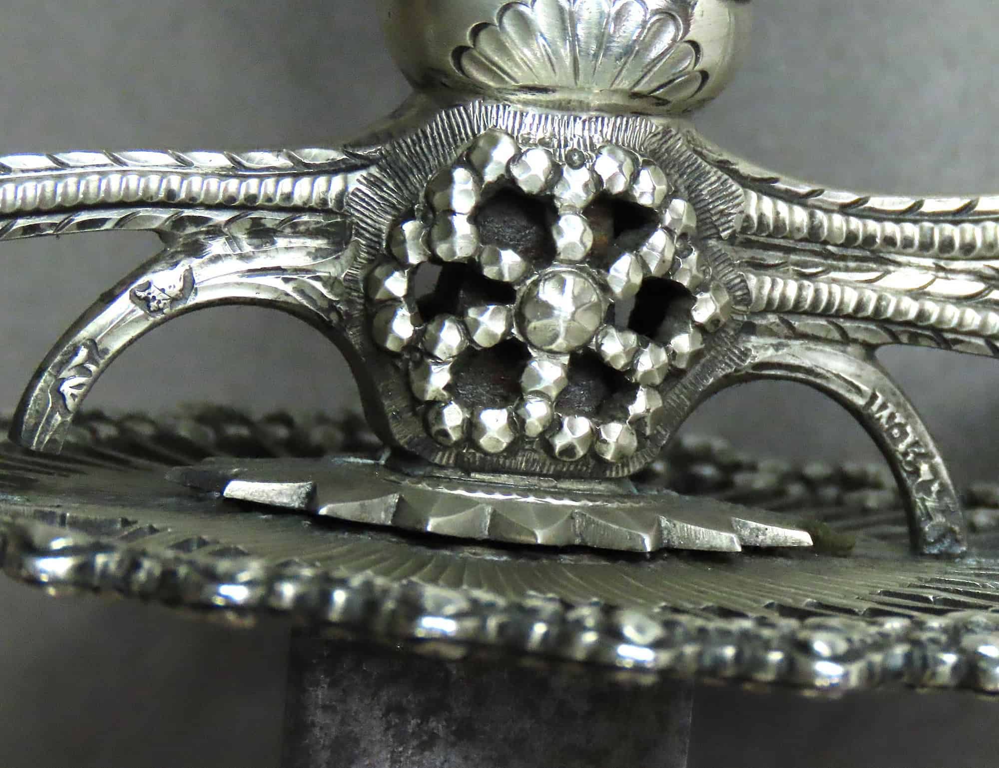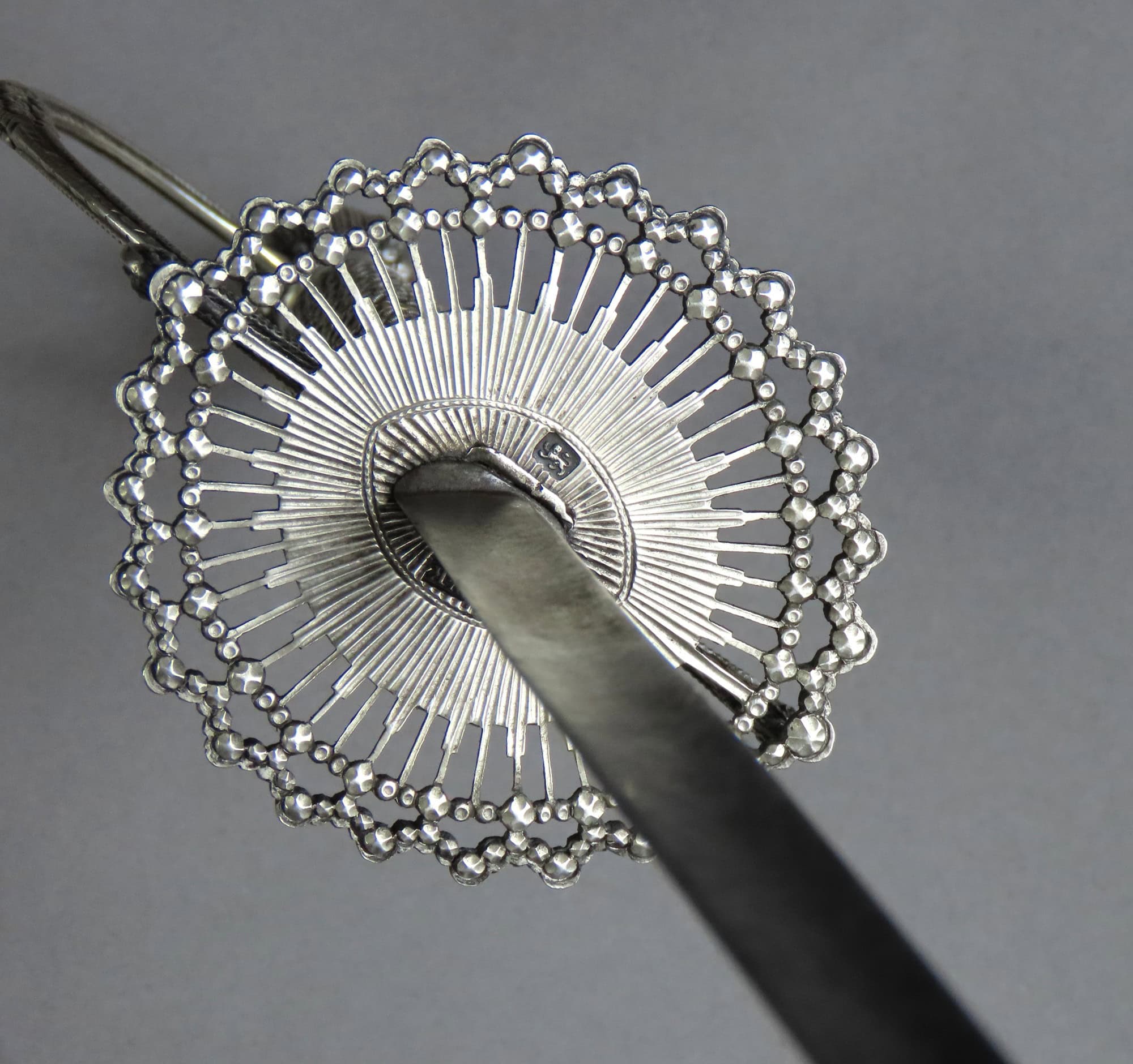 The flat oval guard is of exceptional quality, chiselled and pierced with a sunburst design enhanced with beaded brilliants around the pierced perimeter. The pommel, knuckle bow, and quillon block are worked in a similar manner. The knucklebow is swollen and pierced at the middle.