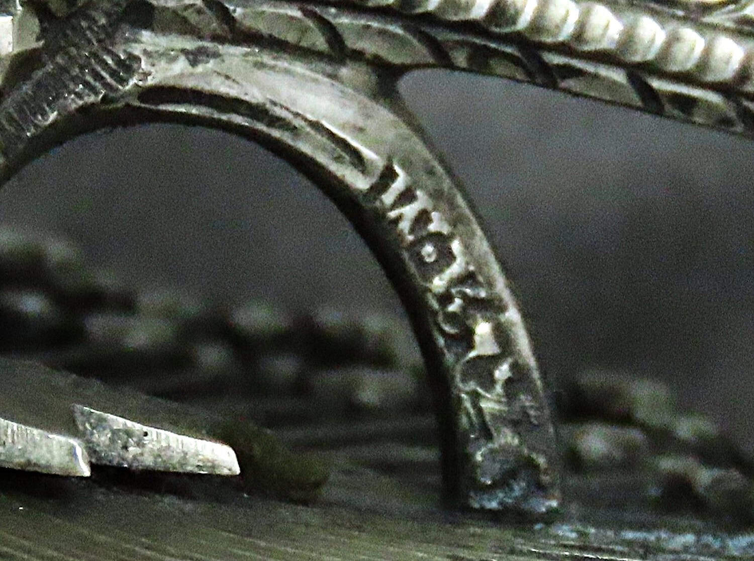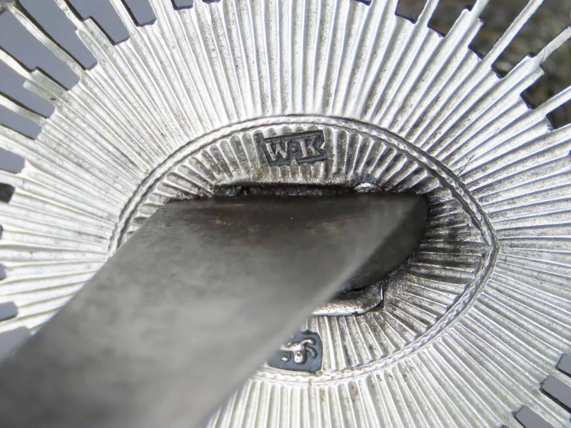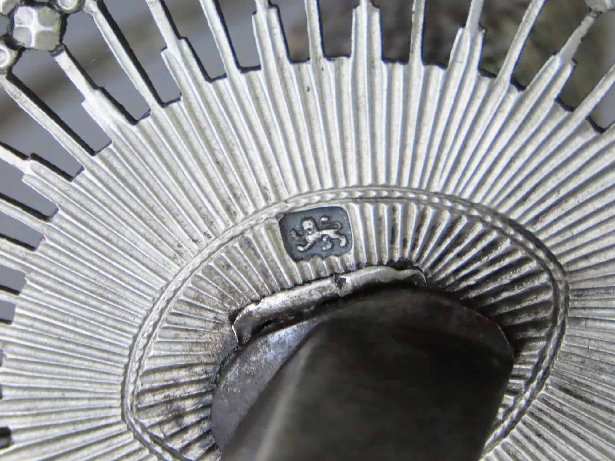 The hallmarks are of small type stamped into the Pas D’Ane rings and consist of the maker’s mark of “W K” in raised relief inside a depressed panel with a pellet between the letters, the lion passant mark, crowned leopard’s head assay mark and date stamp. The underside of the is also stamped with the lion passant and the maker’s mark. The lion passant also appears on the collar at the top of the grip.