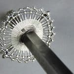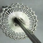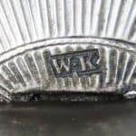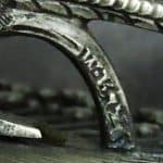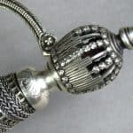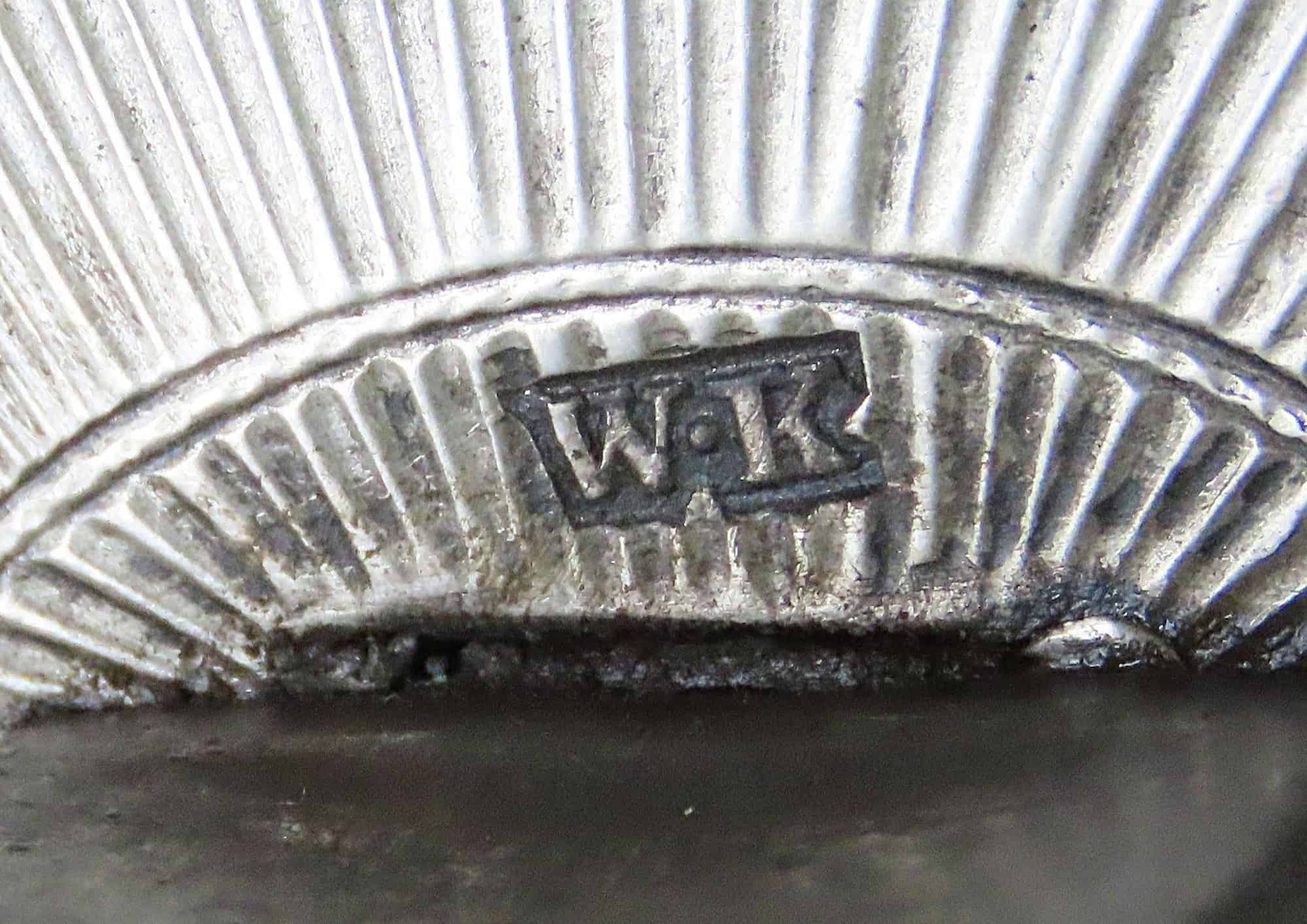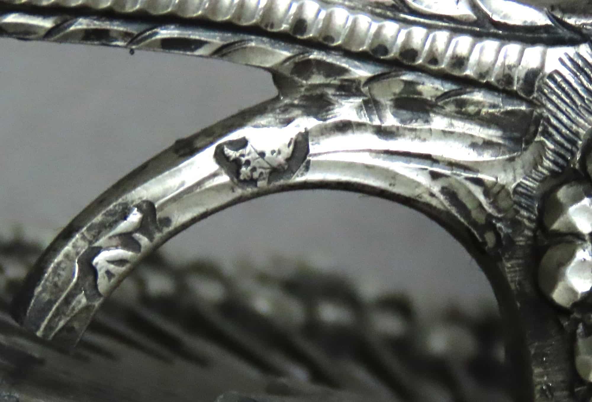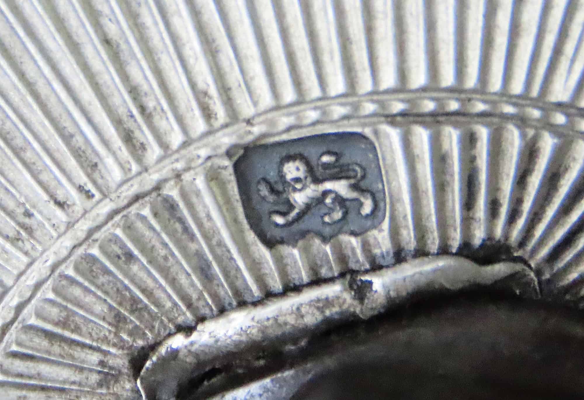 The hallmarks are of small type stamped into the Pas D’Ane rings and consist of the maker’s mark of “W K” in raised relief inside a depressed panel with a pellet between the letters, the lion passant mark, crowned leopard’s head assay mark and date stamp. The underside of the is also stamped with the lion passant and the maker’s mark. The lion passant also appears on the collar at the top of the grip.