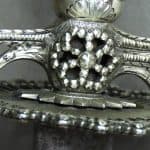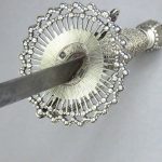 Kinman was born in 1728 and was sworn free of the Founders’ Company in 1750, when presumably he started to make silver hilted swords under his own name and was admitted to livery in 1757. Kinman entered his first mark at Goldsmiths’ Hall in 1759 (Grimwade 1990 reference 3210) which is his mark on this sword. William Kinman was at his most prominent in the earlier part of his career, when this sword was made, later becoming bankrupt due to