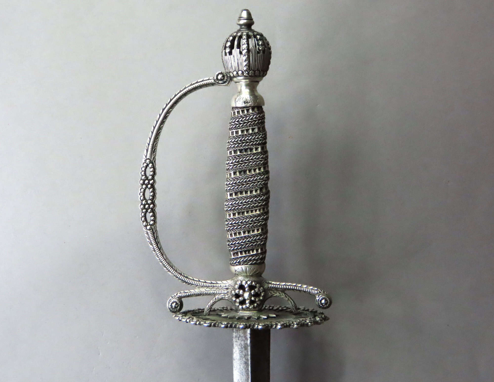 An exceptional silver hilted smallsword by the renowned 18th century London silversmith and cutler, William Kinman, date-stamped for 1775/1776. The hilt is in excellent condition and an admirable example of the London silver hilt makers’ art at this time.